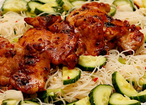 Pour boiling water over the vermicelli and leave for a minute or two until soft. Drain under cold water, put in a large bowl and add the cucumber, mint, scallions and cashews. Add the dressing, toss well and serve with the chicken.