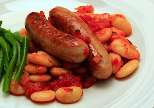 Put the tomato mixture into an ovenproof dish, stir in the beans, then arrange the sausages on top, burying them in the mixture. Roast for 15-20 minutes until the sauce bubbles and the sausages are cooked.
