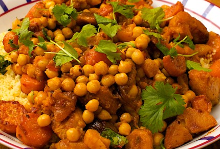 Add the pumpkin, stir and return to the oven. Cook for another 35 minutes or until the vegetables are soft but still have a bit of a bite. Add the apricots and the chickpeas and water. Put it back into the oven for another 10 minutes or until hot.