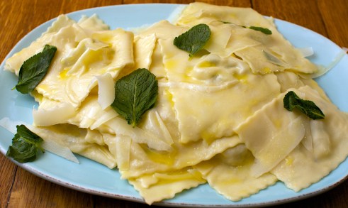 While it is cooking, put a couple of knobs of butter in a frying pan and heat gently. Drain the ravioli with a slotted spoon, reserving a little bit of pasta water. Add the ravioli to the melted butter with a little of the cooking water and lightly simmer until you have a sauce that coats the pasta lightly. Serve on a platter and sprinkle with mint, some pepper and shavings of pecorino.