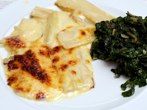 Lightly butter a gratin dish and lay the chard stalks in it. Pour over the sauce and sprinkle with the rest of the Parmesan. Bake for about 20 minutes , or until golden and bubbling.