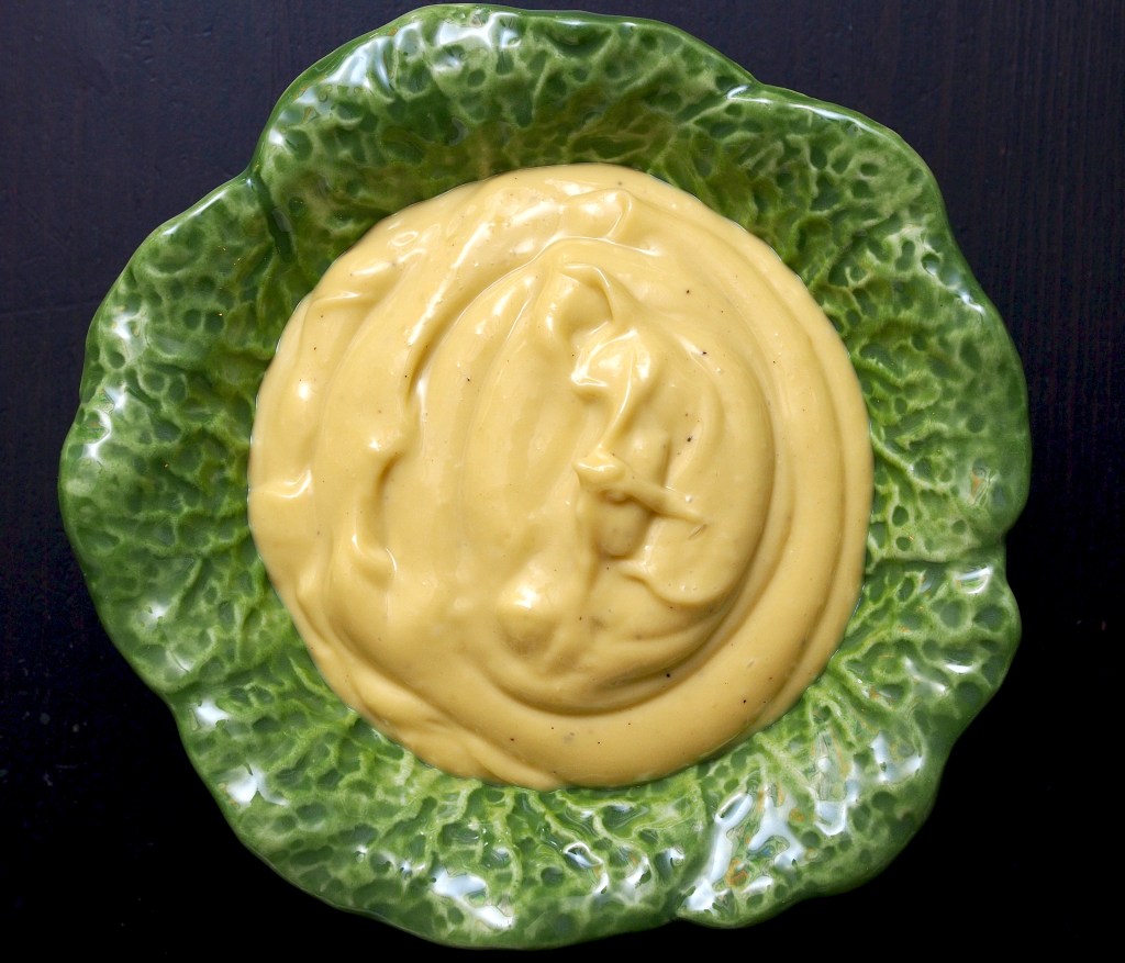 If you go a fraction too fast pouring in the oil, it is easy for it to de-emulsify and go to liquid again as we did with this one. Do not dispair as it’s also easy to save – just pour the split mix into a jug and start again with 10ml water in the food processor, slowly adding the split mix and then the remaining oil. It all, miraculously comes back together again!