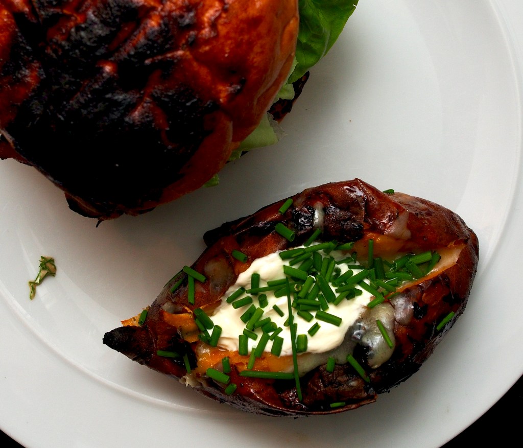 Take the potatoes off the barbecue, top with the sour cream, and snip the chives over the top.