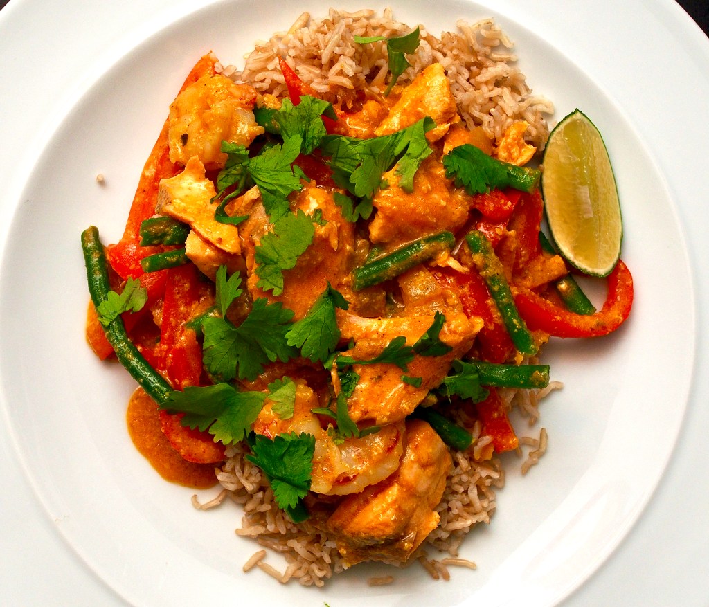 Add the salmon to the sauce and simmer gently for 2-3 minutes or until it turns opaque, then add the prawns and cook for another minute until they are also pink. Test the salmon is cooked by ensuring if flakes easily with a fork, then stir in the cooked green beans. Remove from the heat and add a squeeze of lime.