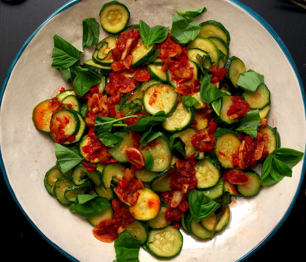 Return the pan to the heat and add the courgettes with 1 ¼ tsp of salt. Cook for 18 minutes, stirring often, until very soft but still holding their shape, don’t let them brown. We had to keep cooking for a few minutes extra to get them really soft but it will depend on how finely you have sliced your courgettes. Stir through half the basil and transfer to a platter. Spoon the harissa mixture over the top and leave for 15 minutes (or longer), then sprinkle with salt and the remaining basil before serving.