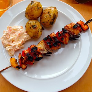 This is such a clever idea, especially if you don’t have one of those fancy things for cooking fish on the barbecue. The fish doesn’t stick to the grill but you still get all the smoky barbecue flavours plus a delicious spike of citrus. The idea has us thinking of other combinations and we loved the caramelisation that happened to the oranges which gives the dish an extra dimension.