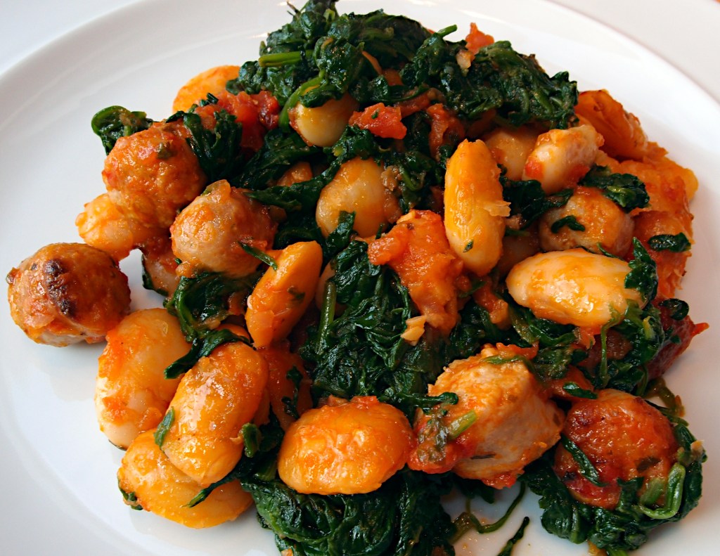 Gigantes me spanaki ke loukanika sto fourno (Bean, Spinach and Sausage Casserole) – serves 4