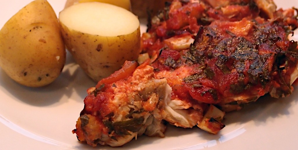 When we find recipes that do something a little differently and look like they work we have to give them a go. In this case Tessa Kiros suggested baking a firm white fish for one and a half hours which to our wisdom was too long to respect the fish flavours and texture but her enthusiasm and passion for the dish won out. The following recipe proved our preconceptions wrong and we had a delightful and flavoursome dish that proved a complete success. Definitely will be made again (and already has been :-))