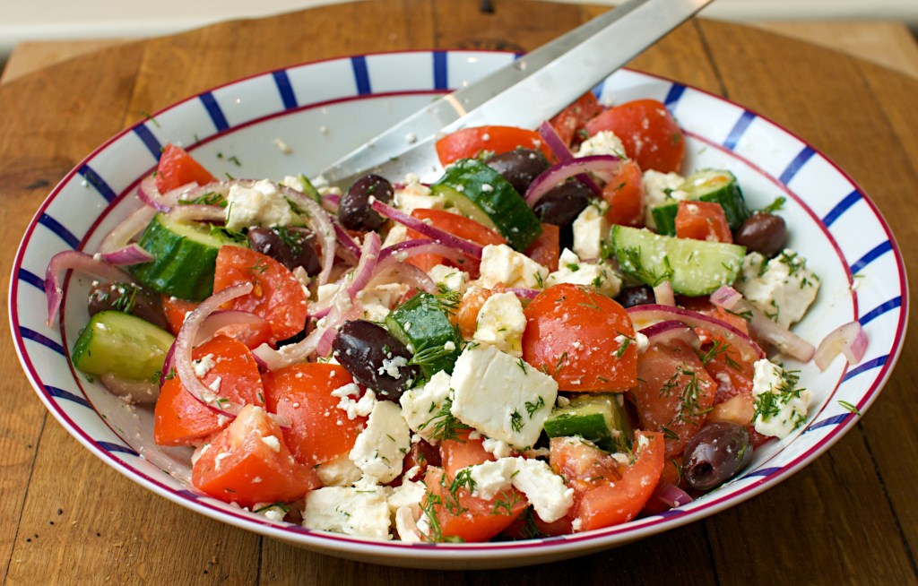 Salata Horiatiki (Greek salad with tomato, cucumber, olives, dill and feta cheese) – to serve 4