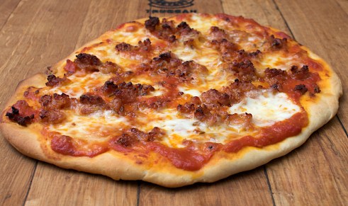 Top with your favourite ingredients – this time we used our trusty tomato sauce, some sausage meat broken up and fried with fennel seeds and some mozzarella which worked a treat.