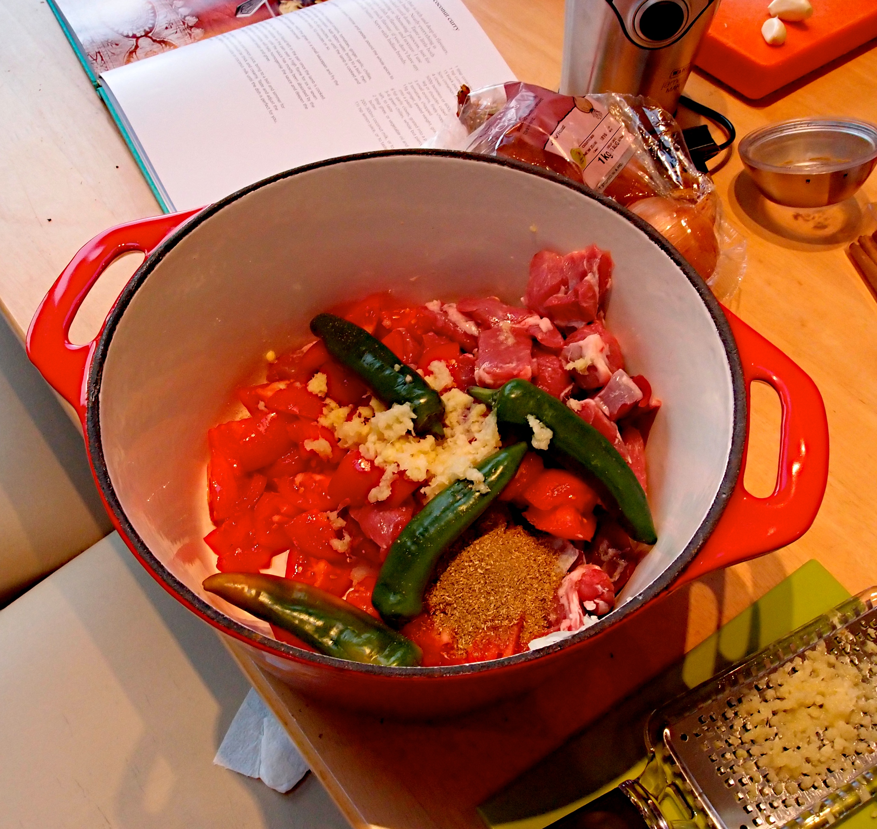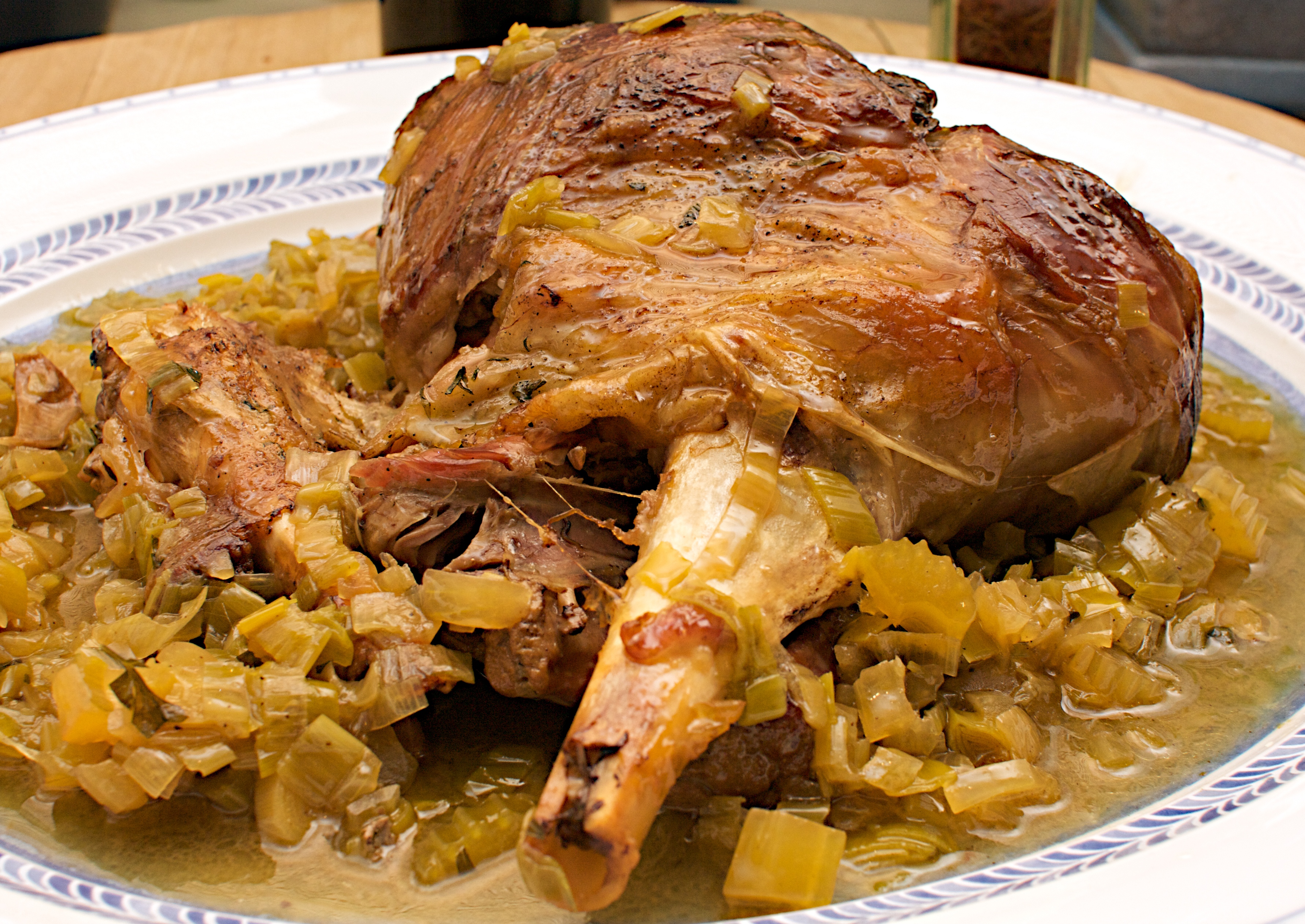 Put the lamb shanks back in, cover with greaseproof paper and a lid and put in the oven for 2 hours, turning the shanks now and then.