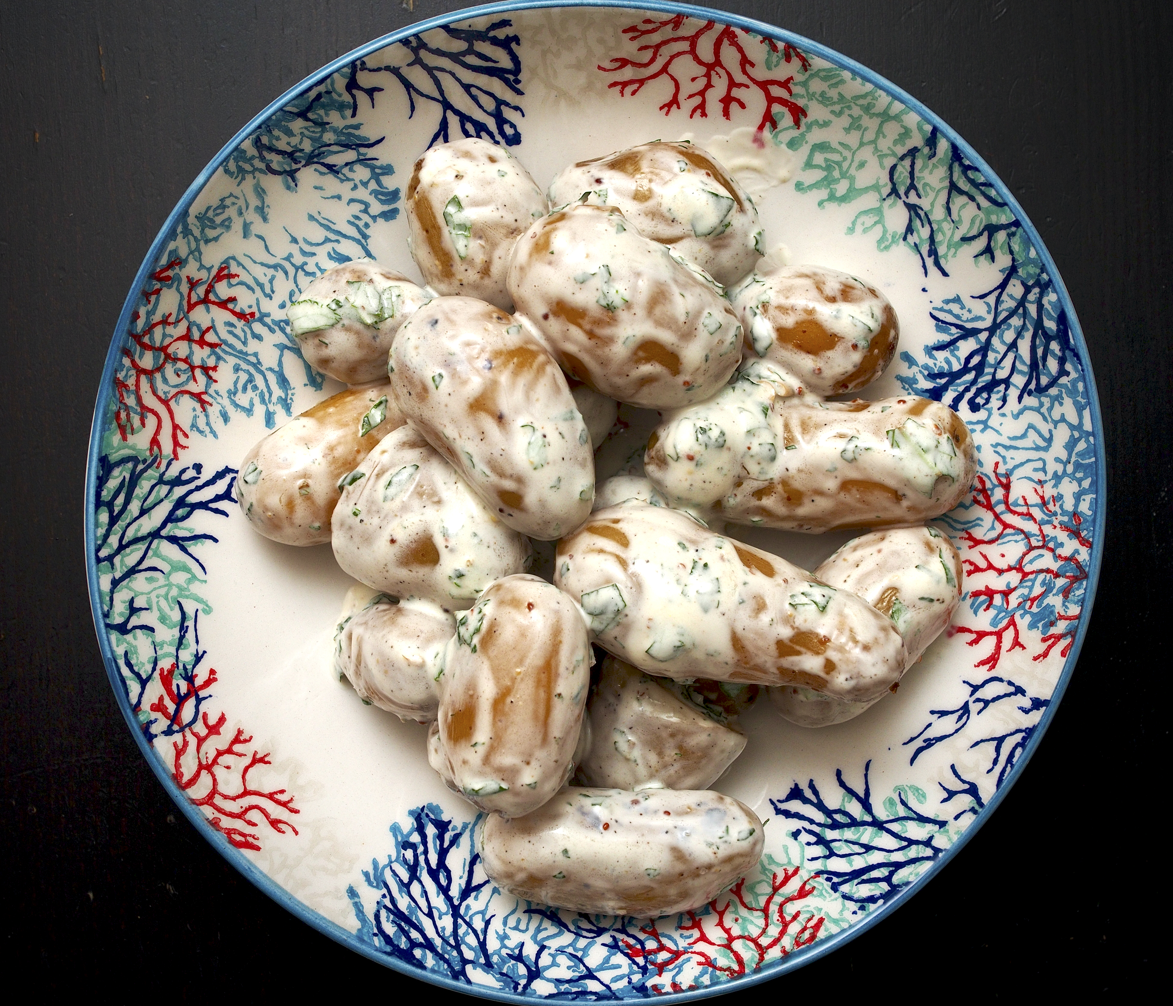 Mix the mayonnaise, yoghurt and mint together and toss with the potatoes. Season with salt and pepper to serve.