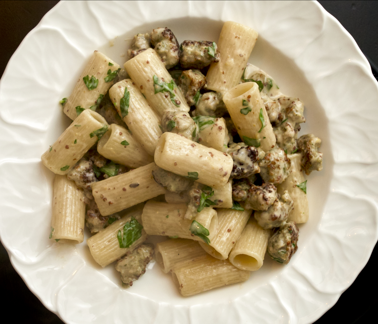 Pour in the wine and let it bubble up, then stir in the mustard, lemon zest and crème fraîche. Simmer until the sauce is the consistency of single cream, then toss with the pasta, a tbsp or so of pasta cooking water and the parsley.