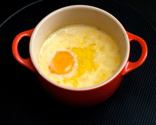 Create a hollow in each dish with a spoon, then gently break in the eggs. Bake the dishes in the oven for about 10 minutes or until the whites are set and the yolks are still runny.