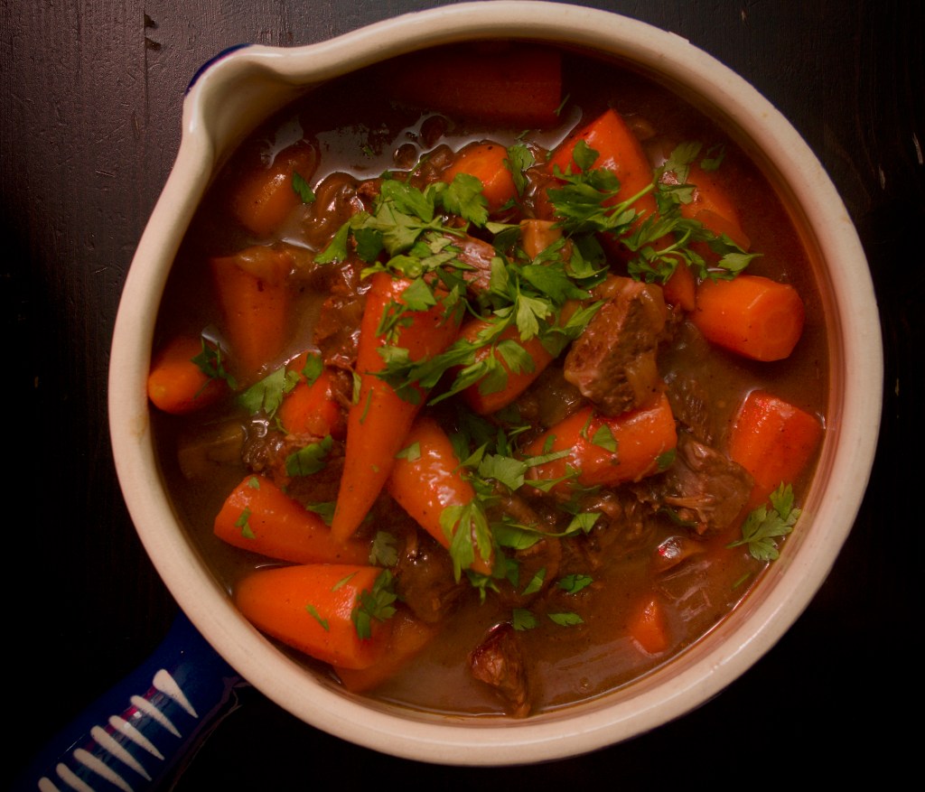 When ready to serve, bring the casserole to the boil on the hob and taste for seasoning. Add the carrots and boil for a few minutes to ensure they are heated through. Sprinkle with the chopped parsley, and serve.