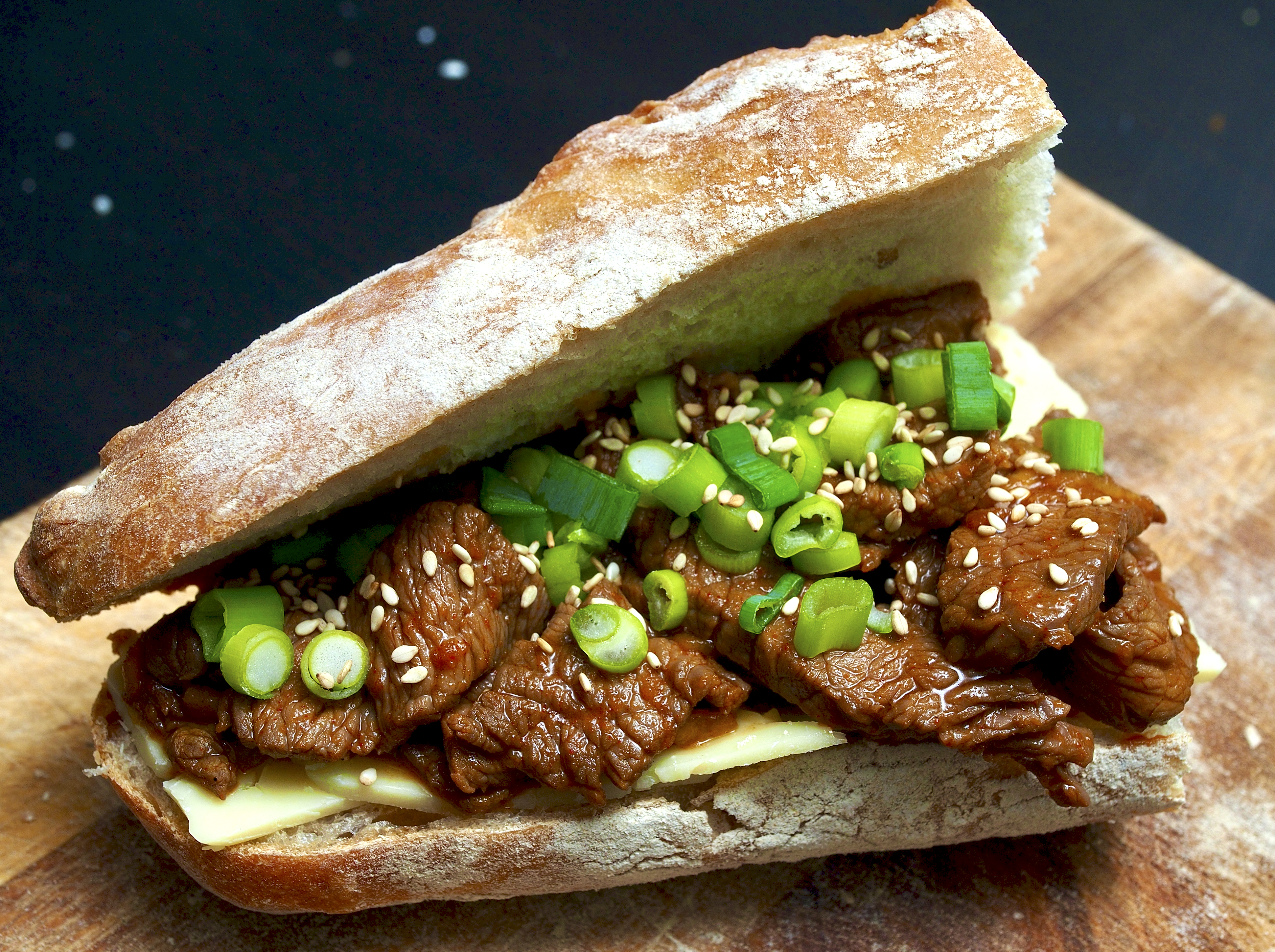 Slice the bavette against the grain and arrange over the onions and tomatoes. Sprinkle with some sea salt, then spoon over the soy and maple butter and serve with the lemon wedges on the side.