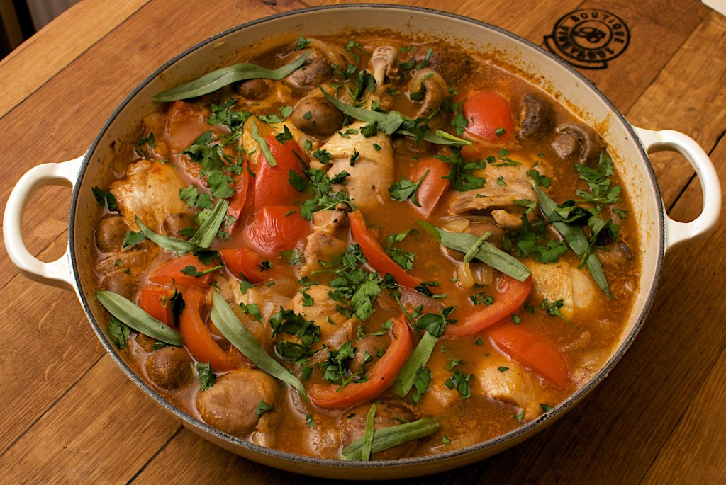 Add the ½ tbsp of oil to the casserole, then add the onions and peppers and cook until the onions are golden and the peppers have softened. Add the garlic and paprika and stir for a minutes, then add the sherry and bring to a simmer.