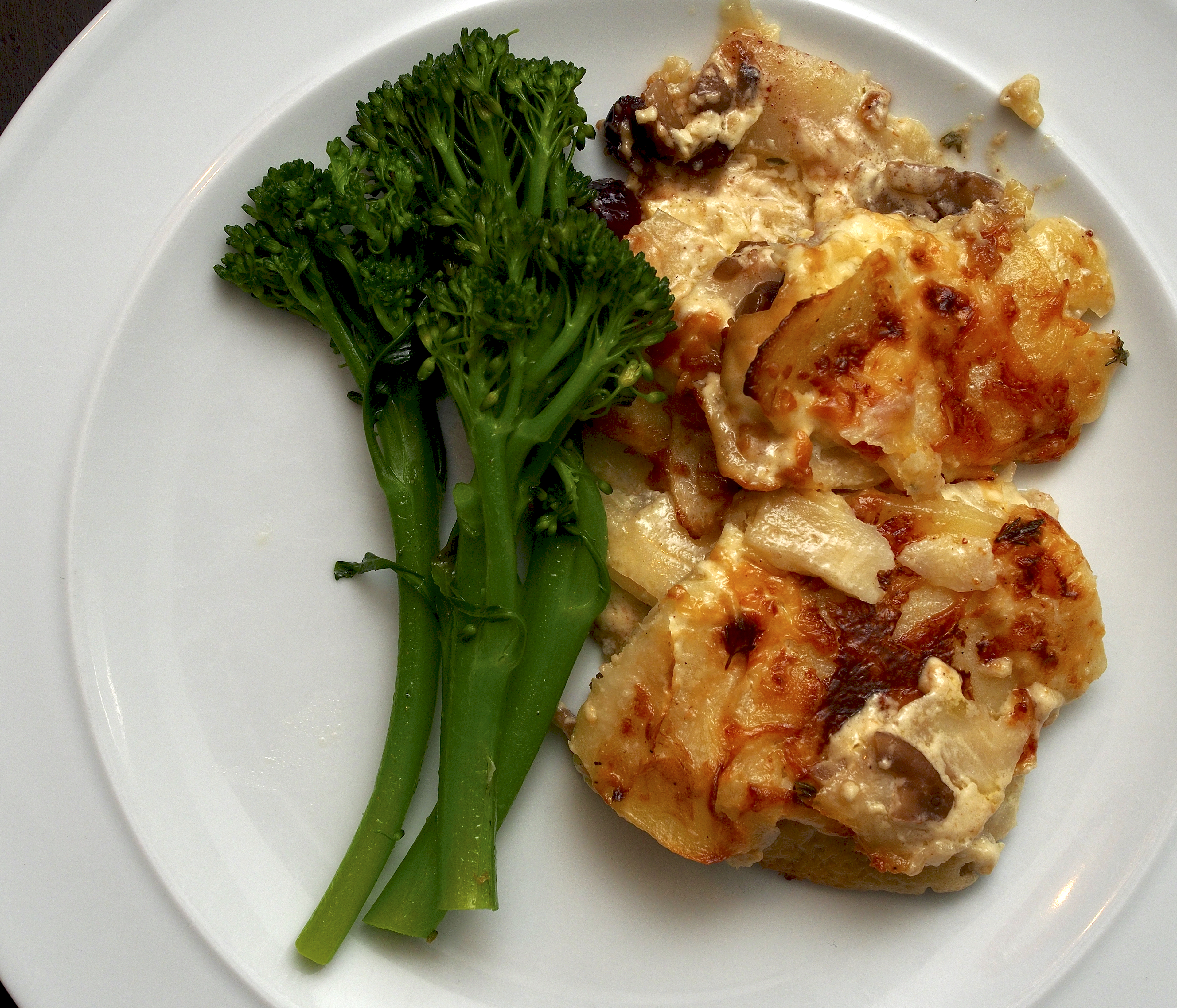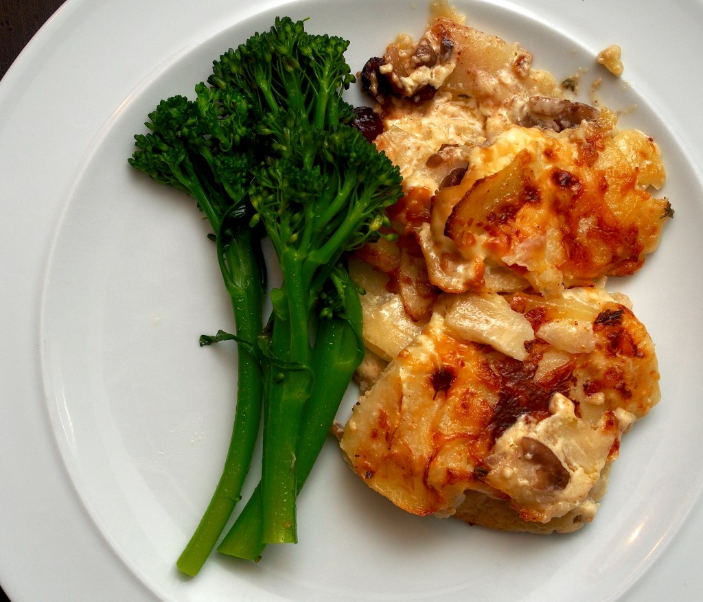 The trick, as with all gratin’s, is to slice the vegetables really thinly. Invest in a mandolin, or use your food processor’s slicing blade, and you’ll get even slices that will cook at the same time. This dish has a lovely festive feel to it and would be great as a side dish for roast chicken (or turkey) or a rich casserole. We served just as it was with some steamed broccoli which was good too.