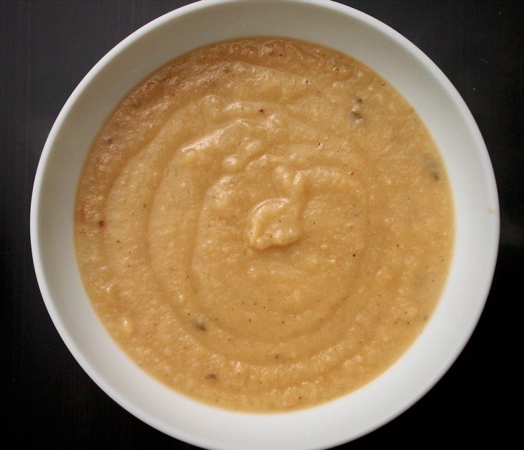Ladle everything except the garlic bulb halves into a blender (or a pot if you’re using a hand blender). Squeeze the roasted garlic flesh out of the skins and add to the rest. Whizz the soup until smooth.
