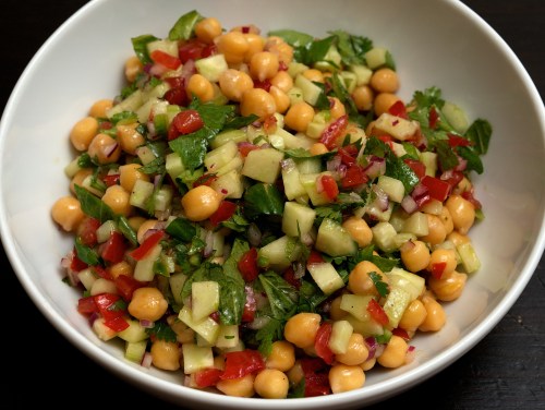 Put the garlic, chilli, onion, lemon juice, vinegar, olive oil, salt and pepper into a small mixing bowl. Stir well and add the rest of the ingredients – the drained chickpeas, cucumber, tomatoes, mint and coriander. Taste for seasoning and chill before serving.