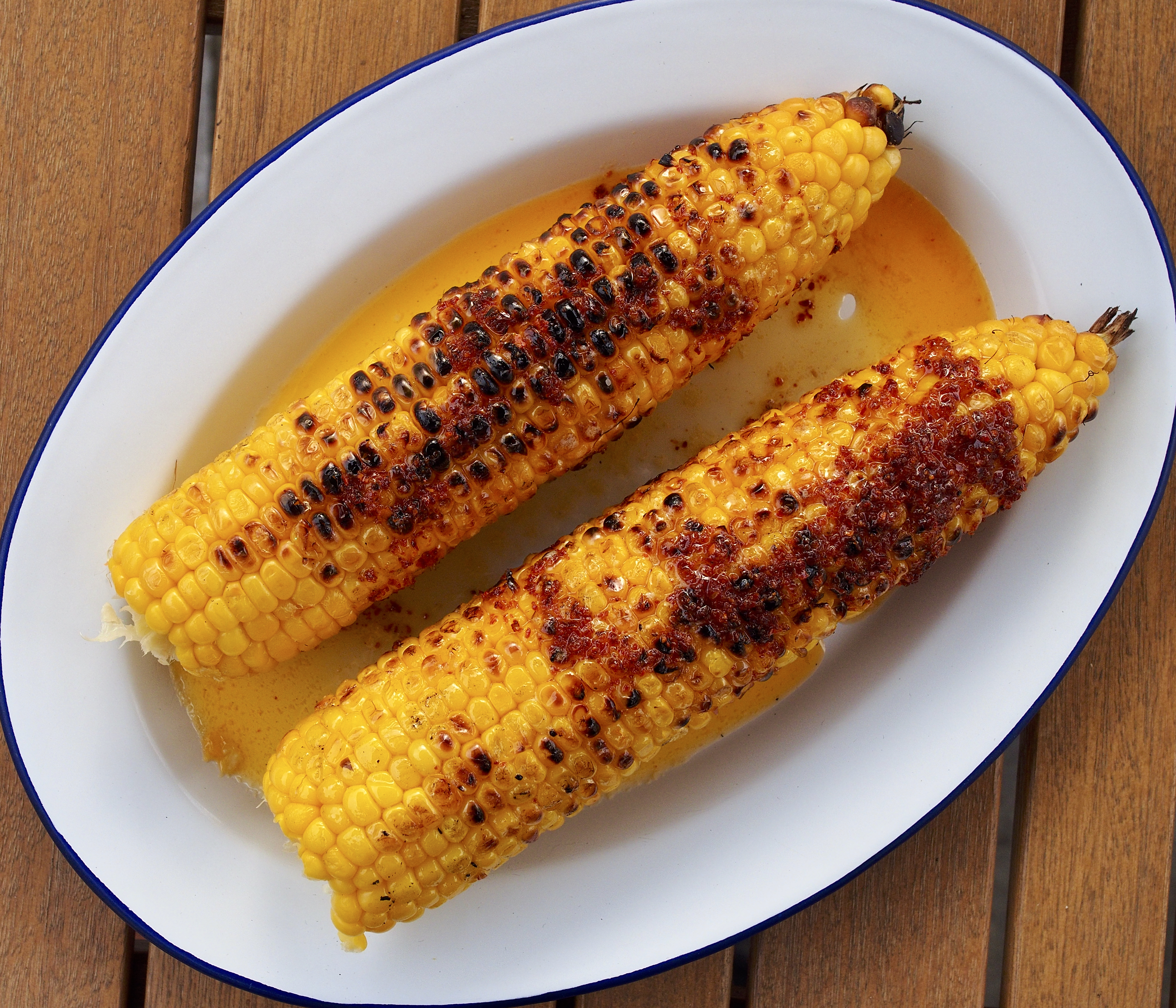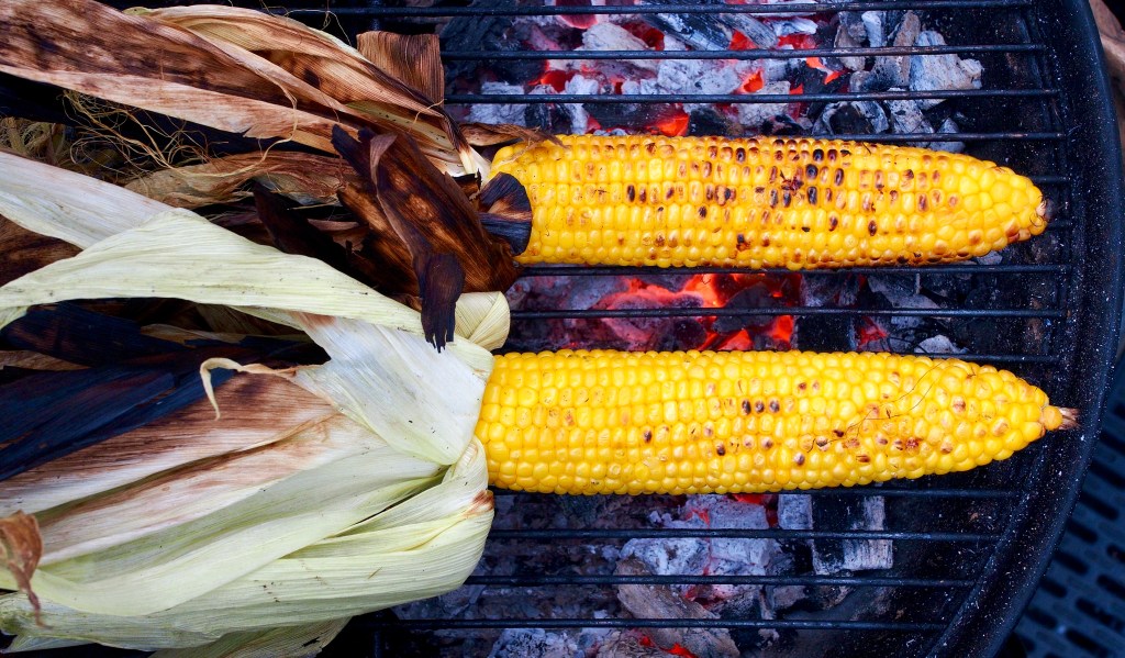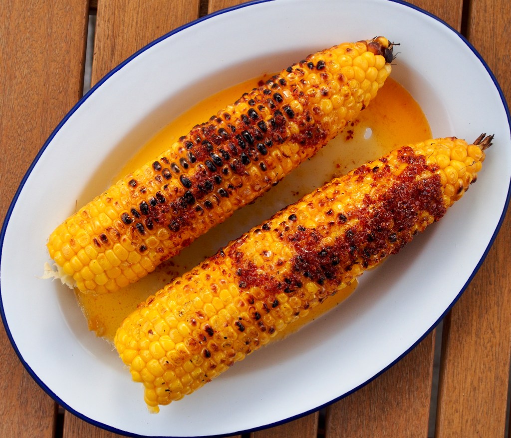 Brush the corn cobs with a little oil, then cook it and the chicken on the barbecue (or griddle) for about 10 minutes, turning often, until cooked through.