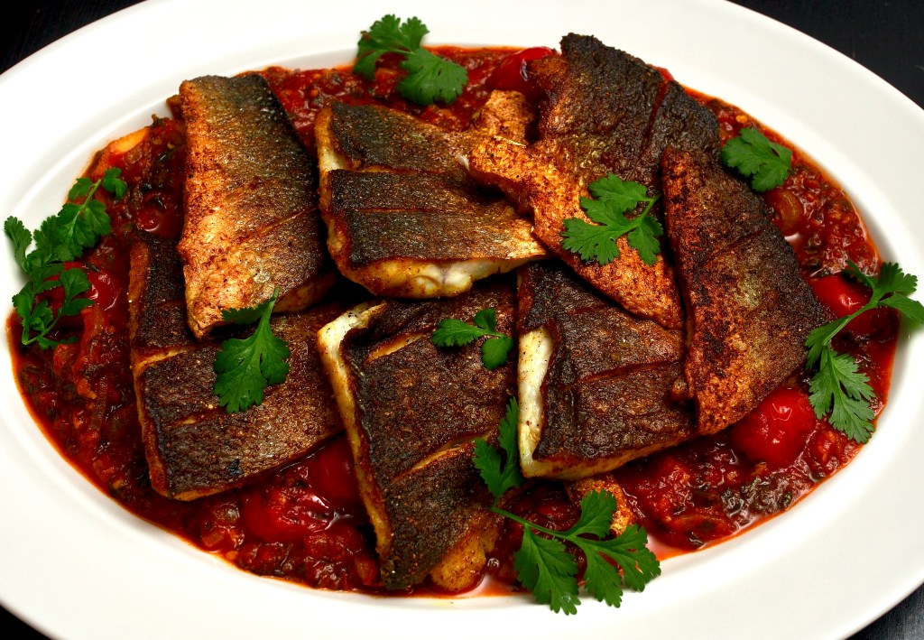 A dish from Falastin, it’s packed with flavour and we recommend adding the optional black olives and feta cheese. A green salad and some crusty bread is also a good choice. The tomato sauce and coriander sauce can both be made in advance, just char your cherry tomatoes and fry the prawns at the end.