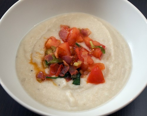 Heat the olive oil in a pan, add the bacon lardons and cook until coloured, then remove from the pan and add the onion. Cook until the onion is translucent, then stir in the garlic. Add the flour and cook for another 2 minutes. Add the cream with 200ml of the reserved strained chicken braising liquid and slowly bring to a simmer, stirring. Remove from the heat and season.