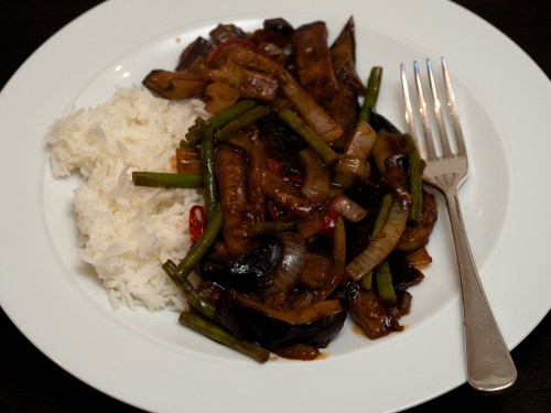 This photo is a bit dark in colour but the flavours are vibrant and delicious and we’re now converts to soaking aubergine in brine before stir-frying to give a soft, velvety texture.