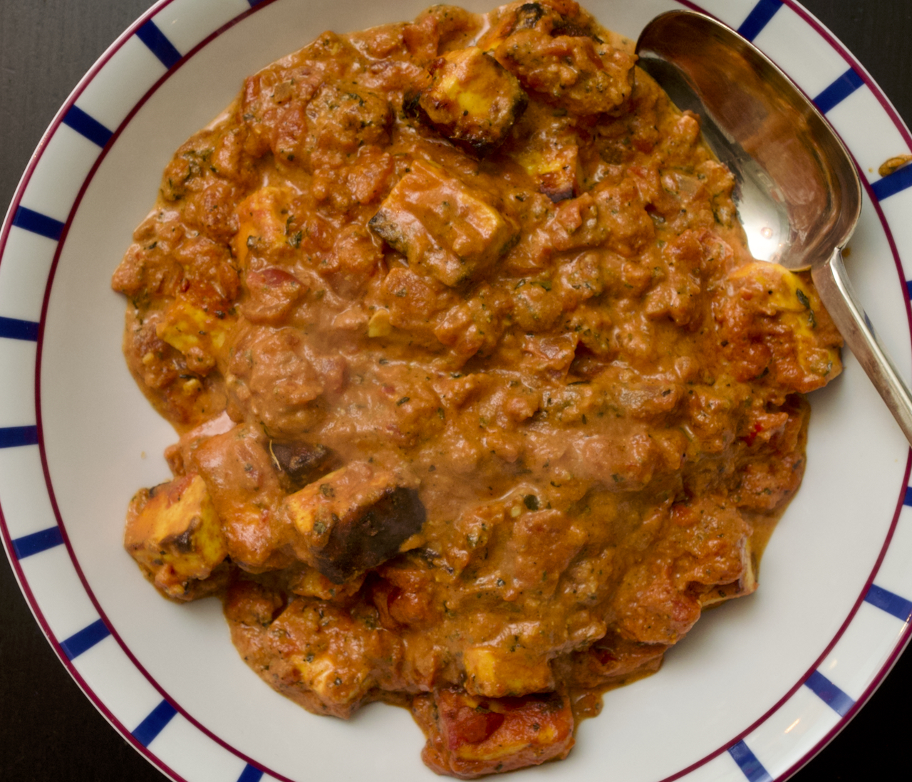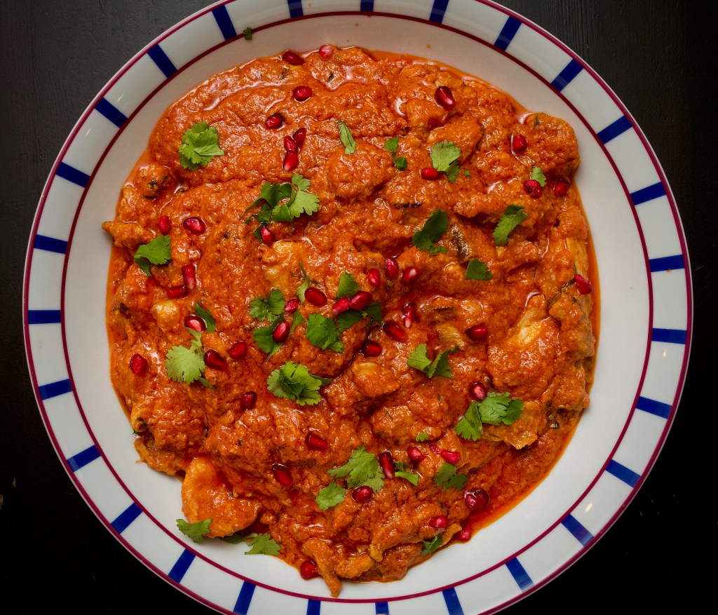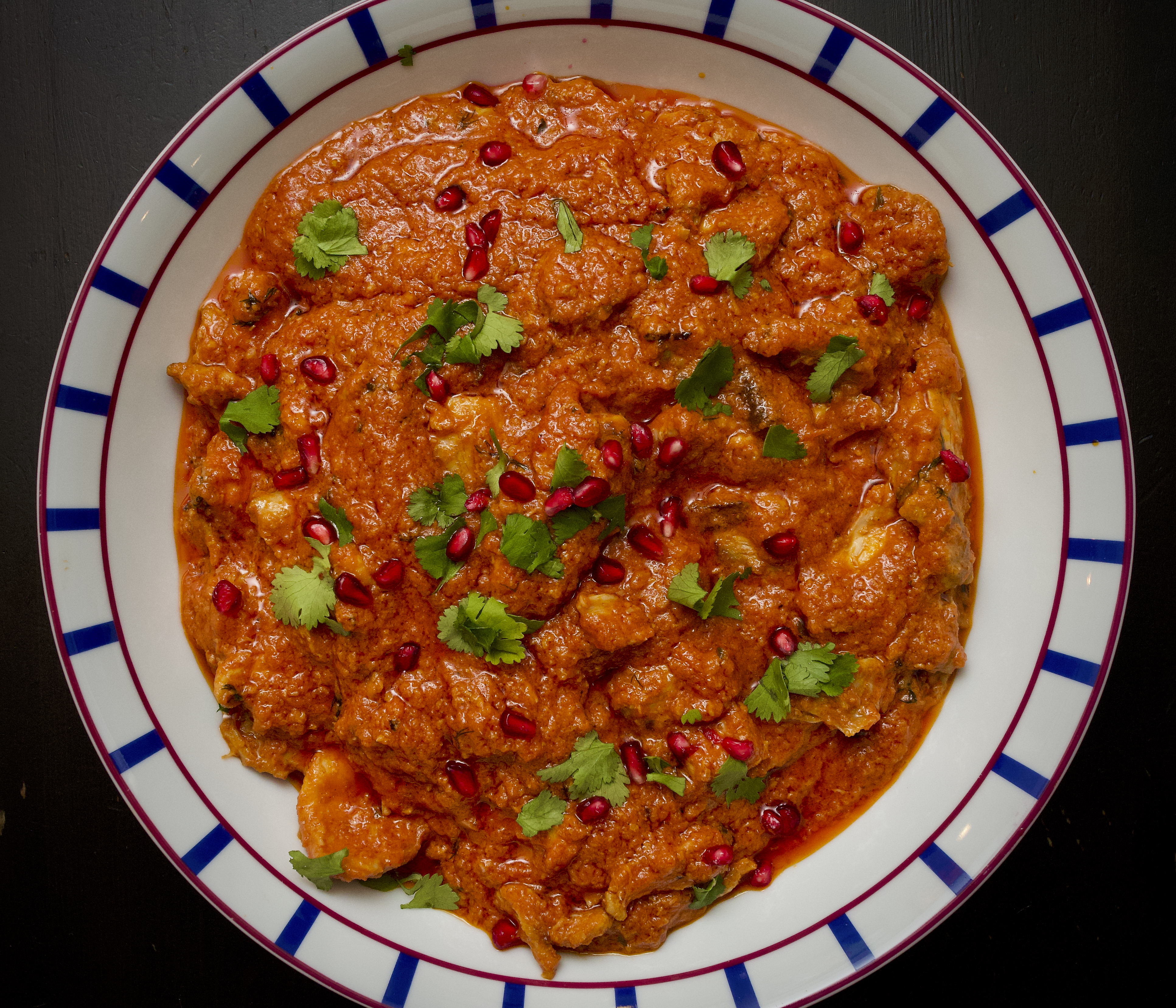 Remove the tray from the oven and stir through the cream, crumble over the kasoori methi, then stir again and put back in the oven for another 10 minutes. Remove the tray from the oven and stir in the butter. Serve with hot naan breads.