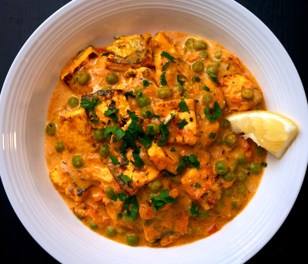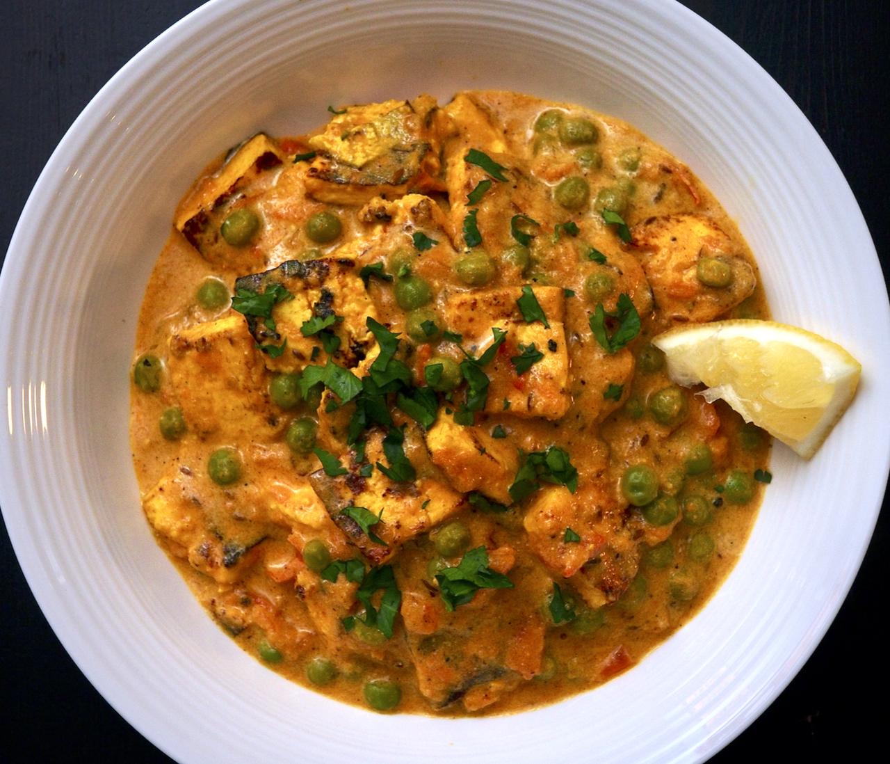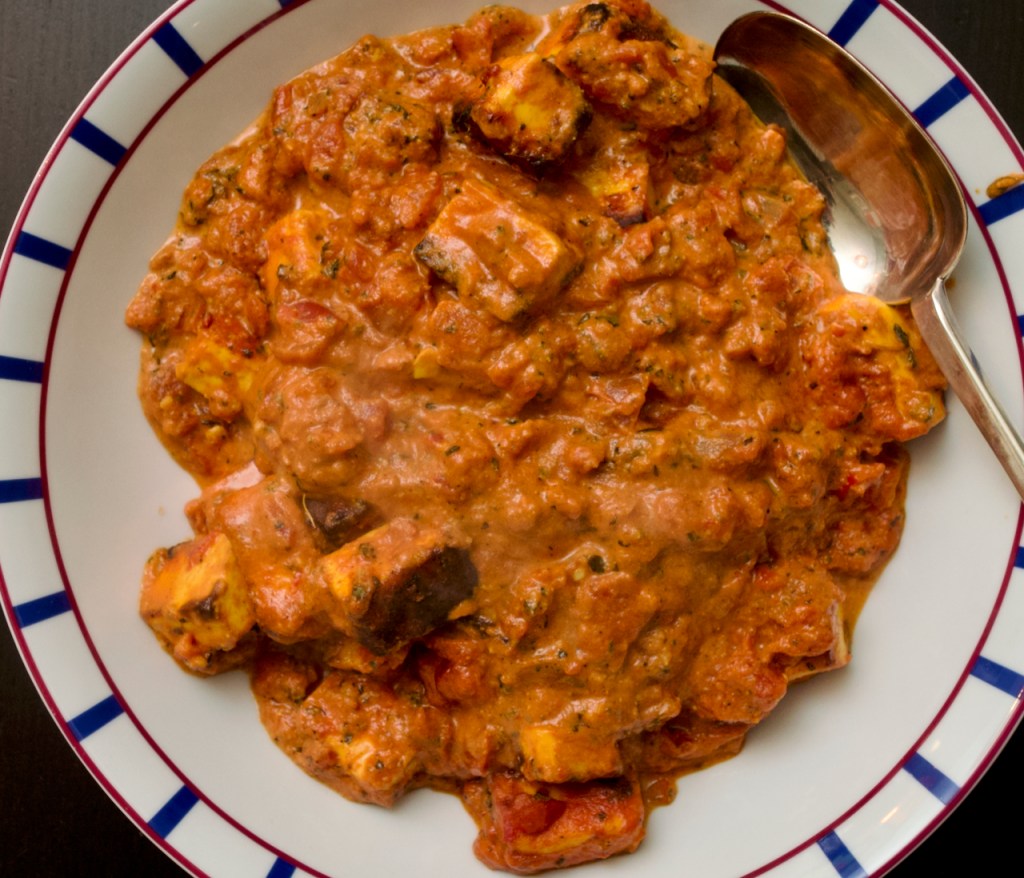 Remove the tray from the oven and stir through the cream, crumble over the kasoori methi, then stir again and put back in the oven for another 10 minutes. Remove the tray from the oven and stir in the butter. Serve with hot naan breads.