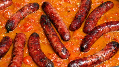 Despite the simplicity of this dish it really showcases perfectly ripe cherry tomatoes; excellent when the garden is overflowing and you’re trying to think of recipes to use them all! One of our butchers does great, meaty and coarsely filled chipolata sausages which we used here, but Cumberland or coarse Italian ones work just as well. Leftovers make a great pasta sauce (see below).