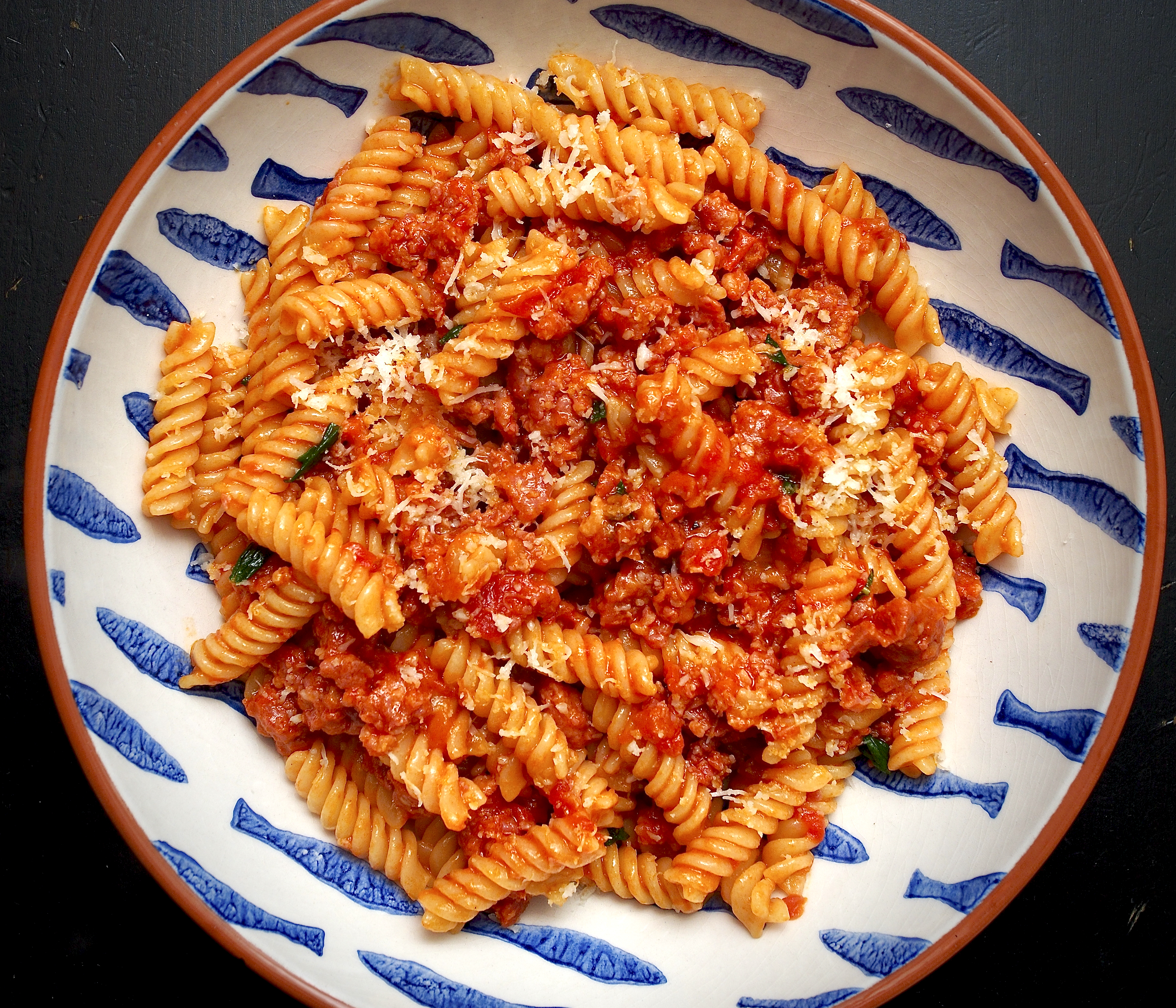 Drain the pasta but keep a little cooking water in case you need to thin the sauce. Stir the pasta into the sausage sauce and simmer for a few minutes. Serve in warm bowls with pecorino sprinkled over.