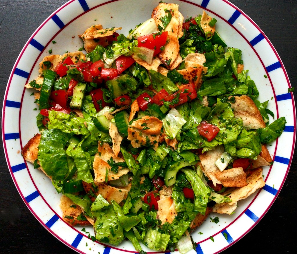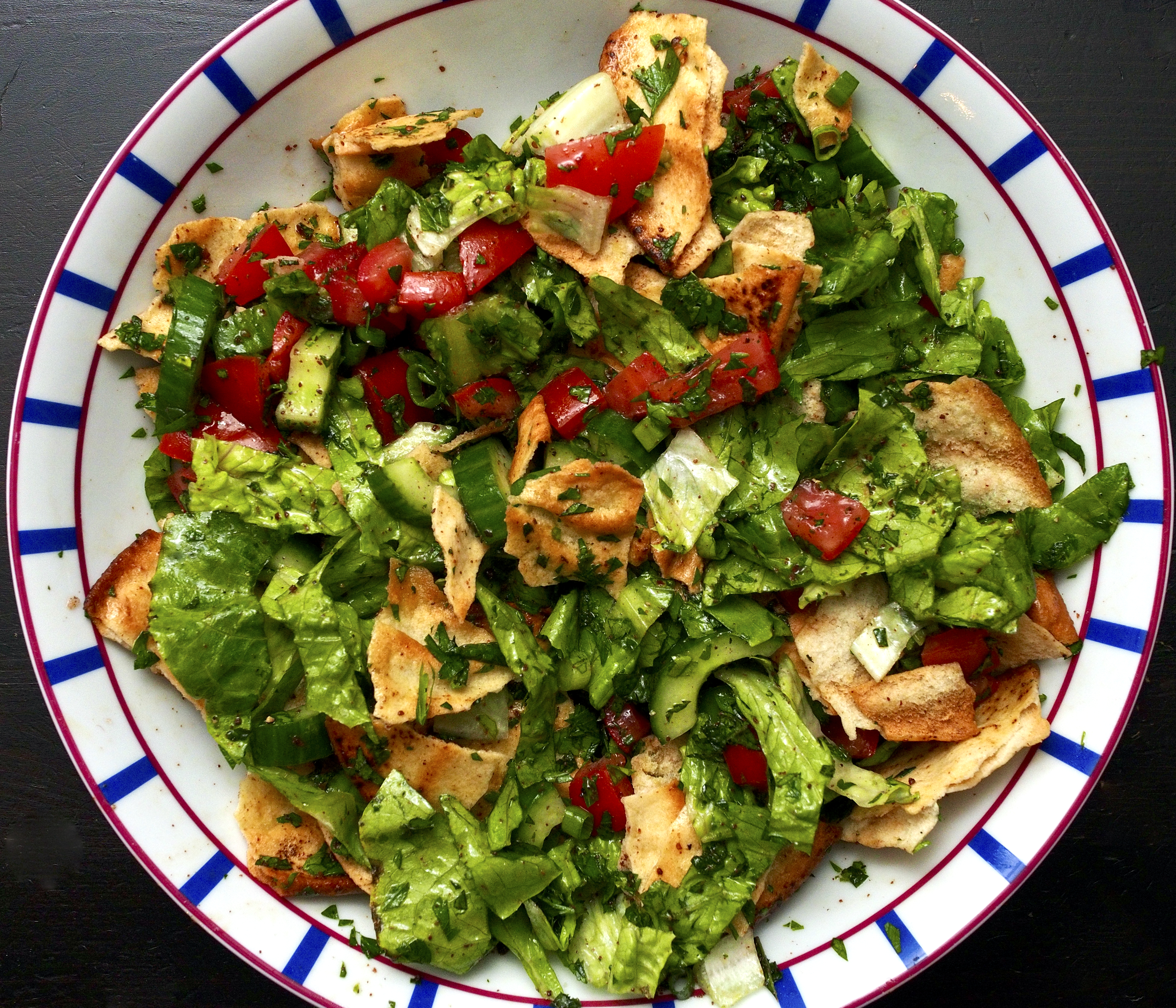 Cut the tomatoes in half and scoop out the seeds, chop the flesh into pieces the same size as the cucumber and add the bowl with the crispy pieces of bread. Add the lettuce and herbs.