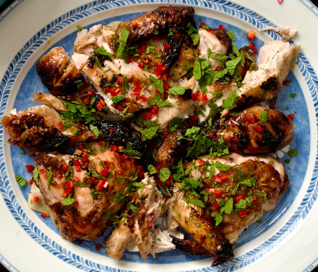 Mix the ingredients for the marinade together, keeping a small handful of herbs aside to garnish at the end.