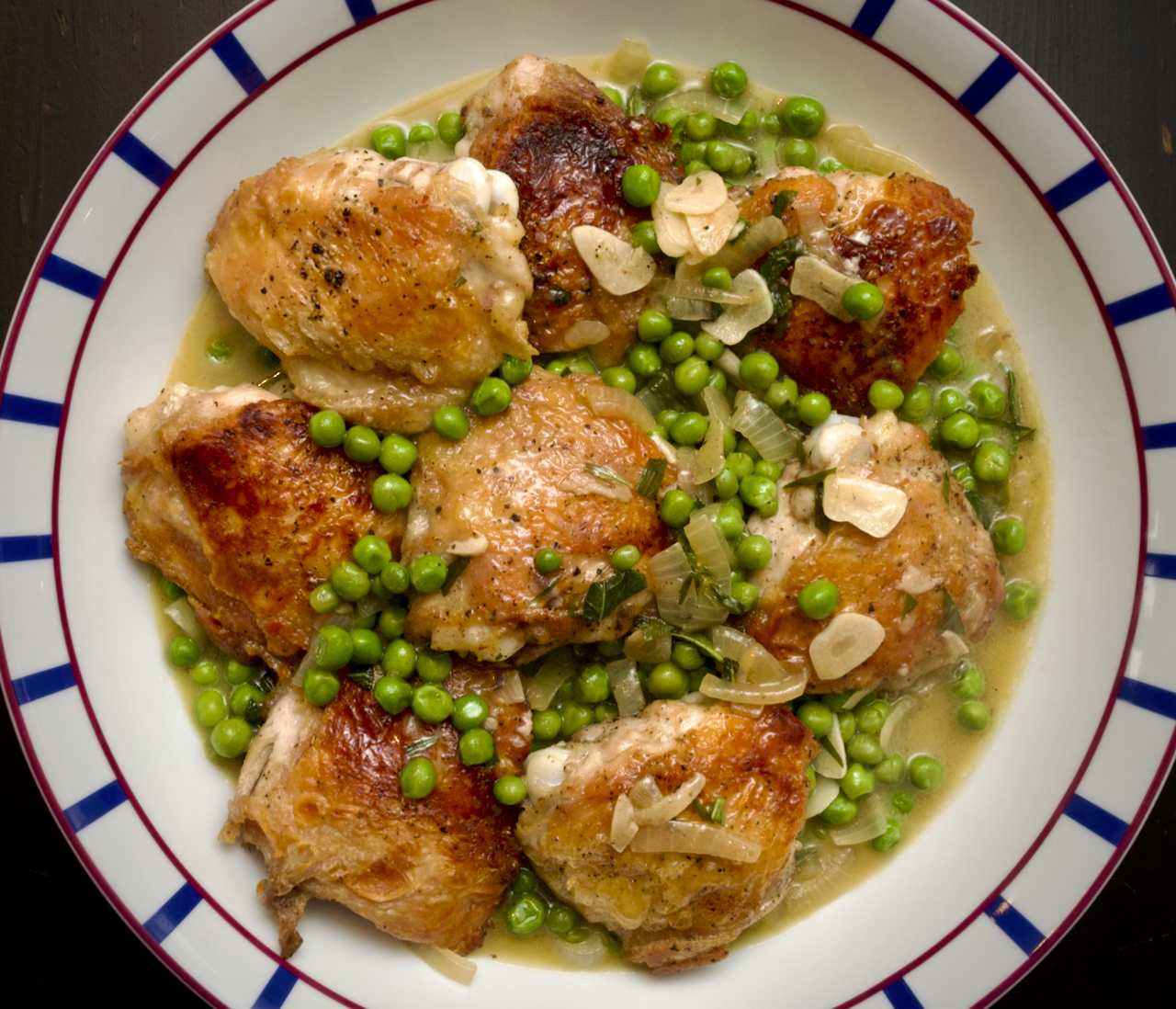 Remove the chicken from the oven and add the thighs to the pan with the peas, pouring over any juices on the tray. Stir and season with salt and pepper, then serve.