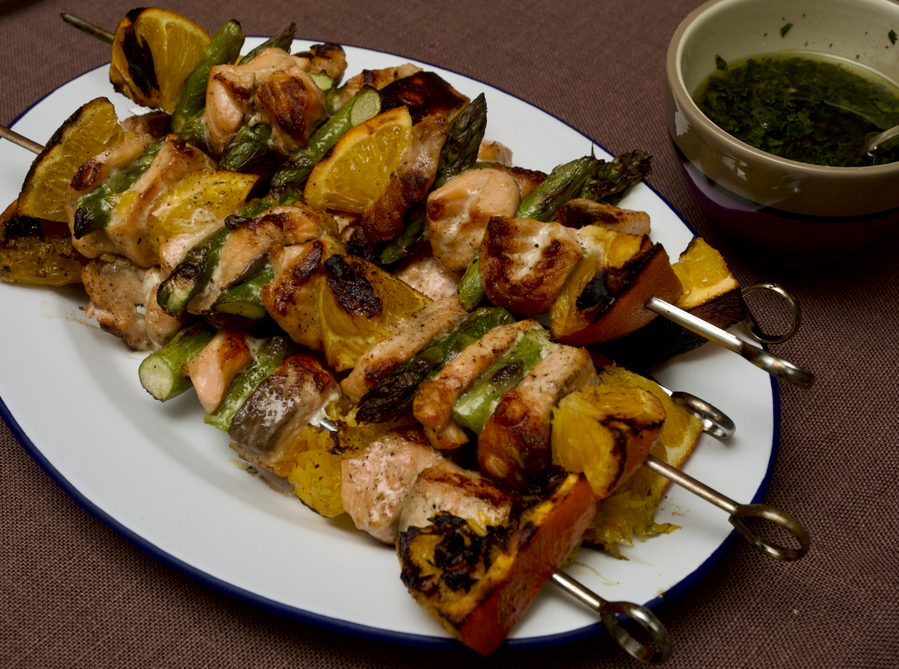 Thread the trout, asparagus and orange pieces onto 4 metal skewers. If your fish pieces are a bit skinny just fold them over and thread them on to make a chunkier piece.
