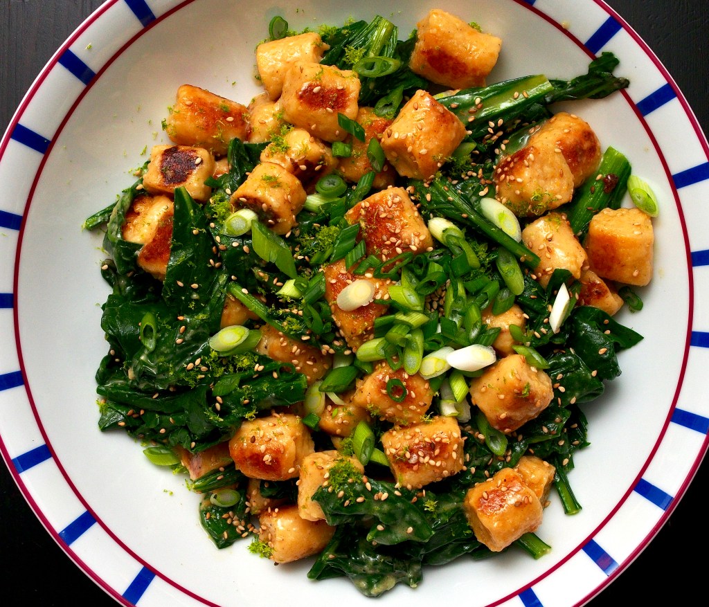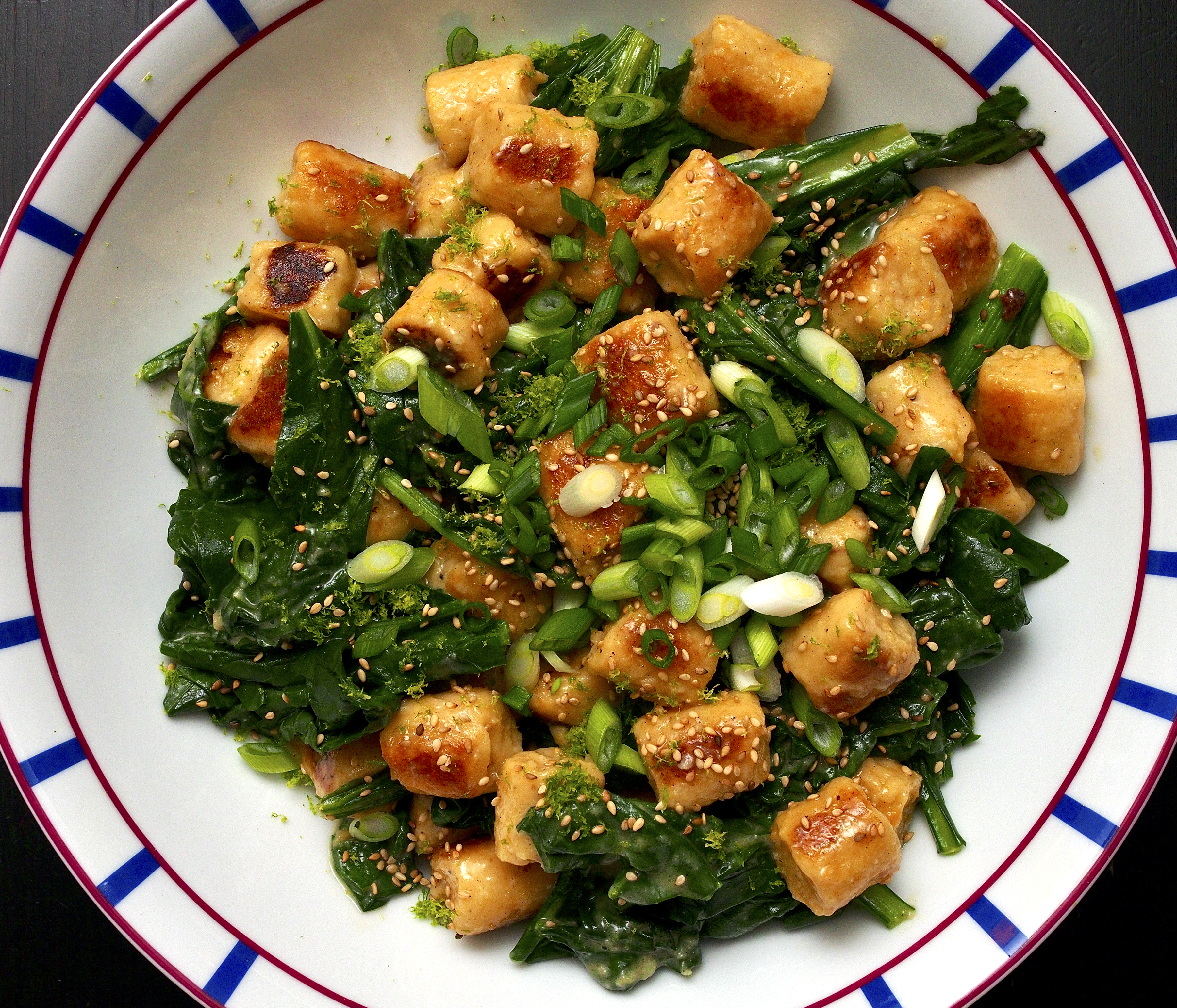Meanwhile, put the butter into a small saucepan with the sesame oil. Put the pan over a medium heat and stir until the butter has melted. Remove from the heat and stir in the lemon zest and juice, tahini and toasted sesame seeds. Stir well and set aside.