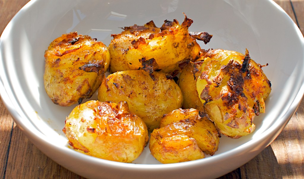 Heat oven to 200C/fan 180C/gas 6. Boil the potatoes for 10 minutes, drain and then put back on the warm ring to dry off. Spread the potatoes out on a baking tray and squash them a bit using a potato masher. Be careful here as you only want them a bit squashed and not completely smashed (though I smashed one or two and it just made them even more crispy so don’t worry too much).