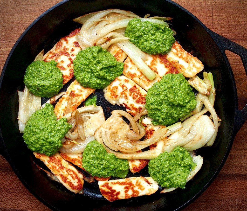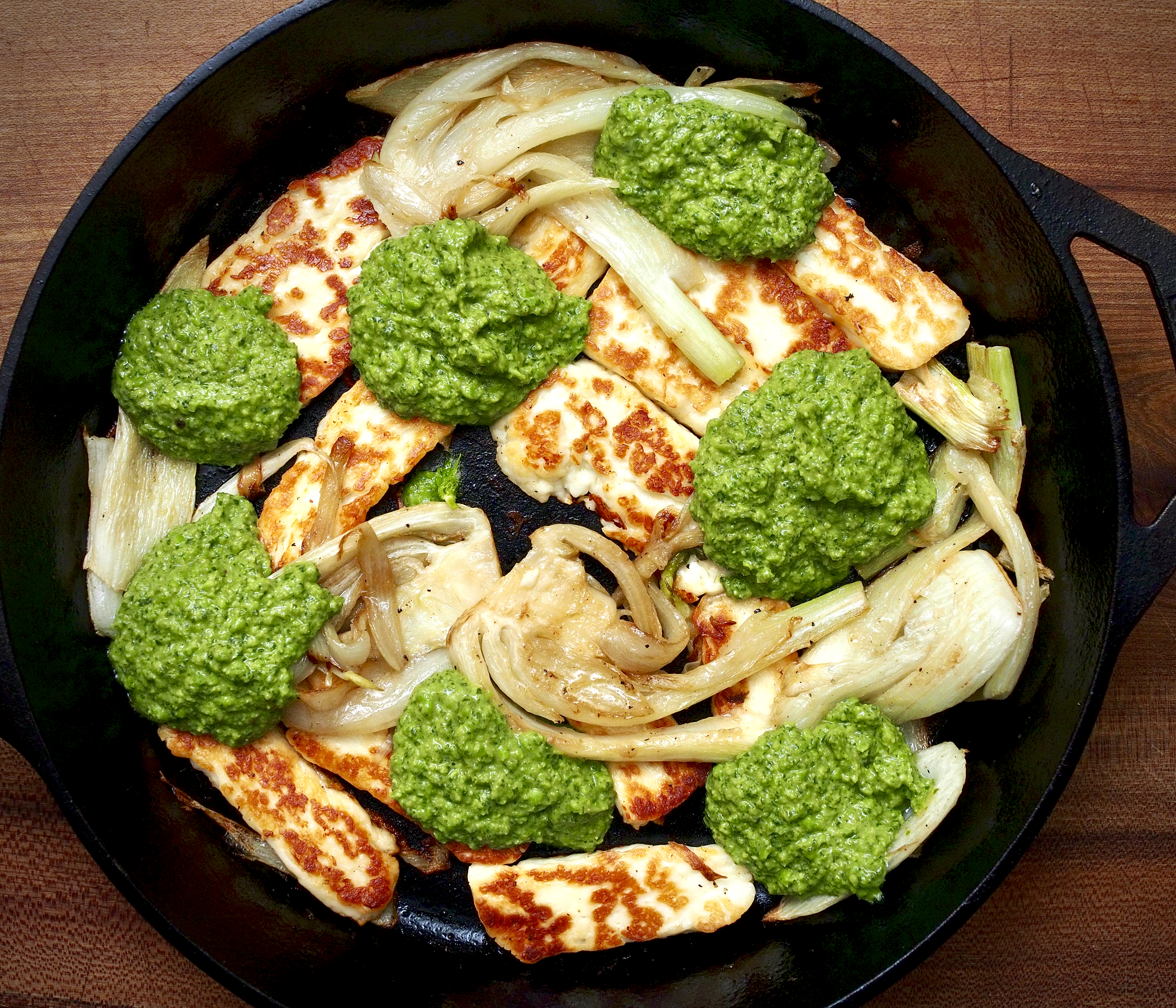 Place the halloumi in the pan, tucking it in wherever you can so it browns on the pan. Allow to turn golden on both sides.
