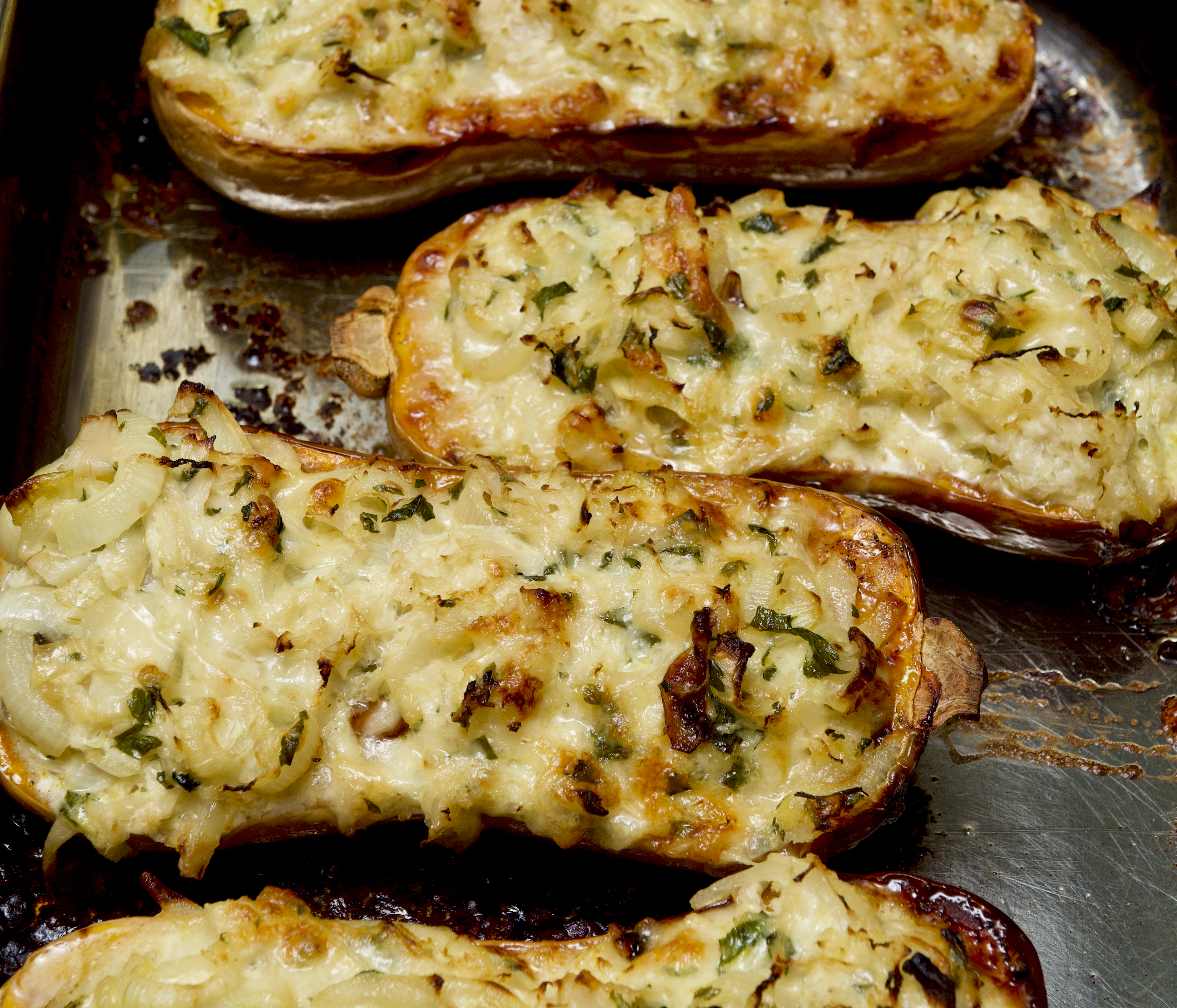 When the squash are ready, divide the cheese and sauerkraut mixture betwen them, then return to the oven for another 20 minutes or until golden and bubbling.