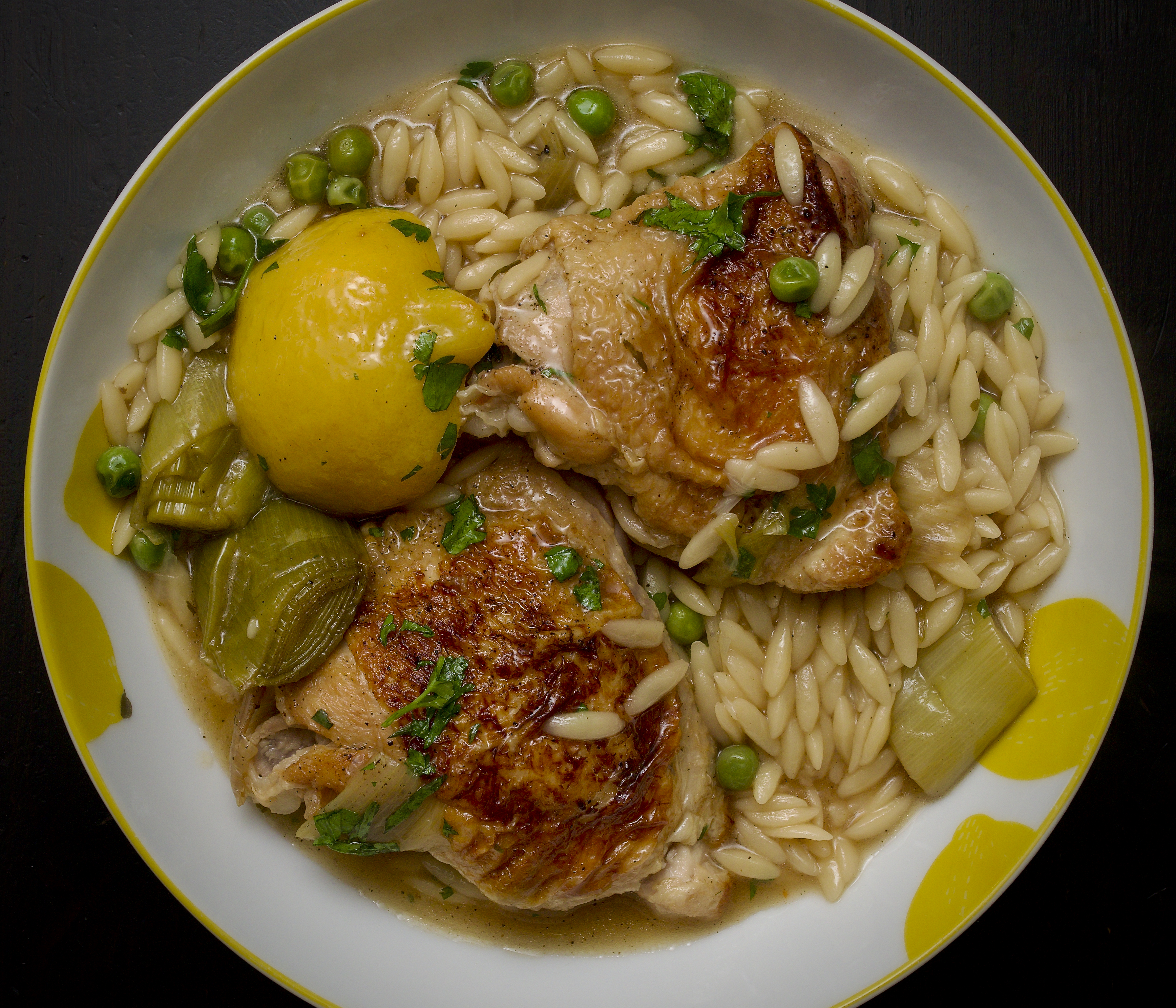 Add the stock and stir with a wooden spoon until it comes to the boil, then add half the lemon, peppercorns and 1 tsp of salt. Scatter in the orzo and boil for 3 minutes. Return the chicken to the pan, then cover and bake for 35 minutes.