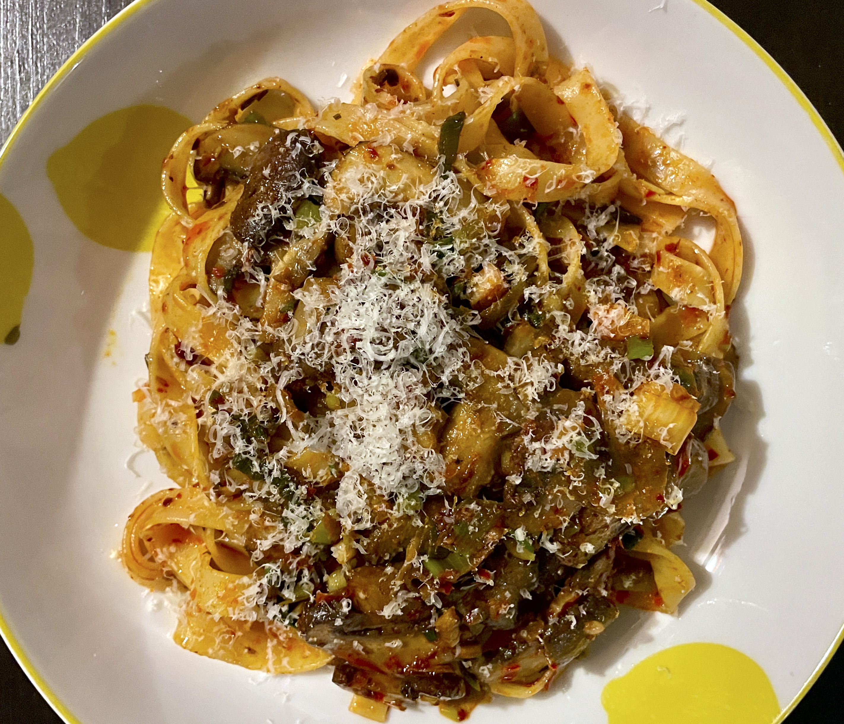 We’re all about creamy sauces, gratins and roasts at this time of the year. This is a great Friday night pasta dish by Nigel Slater with all the roast chicken flavour but quick to put together.