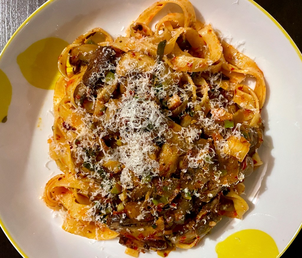 Drain the pasta quickly and not too well, then tip into the pan with the mushrooms. Toss everything together, then serve in warm bowls with the Parmesan sprinkled over.