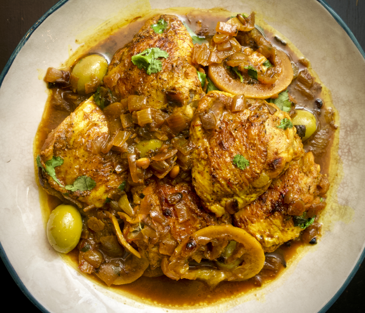 Add the lemon to the pan and enough water to come halfway up the chicken pieces. Stir in the saffron, season well, then cover with a lid and simmer for 25 minutes, or until the chicken is cooked through. Add the olives and coriander and serve.