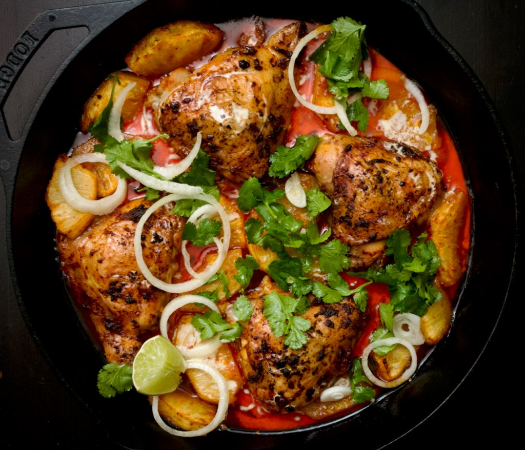 Put the ingredients for the ‘nduja and chipotle paste into a large bowl and mix together. Add the chicken thighs, garlic, and about ¾ of the onion and mix together well. Tip everything into a large oven-proof cast-iron frying pan or a baking dish. Make sure the chicken is skin-side up on top of the onions and garlic.