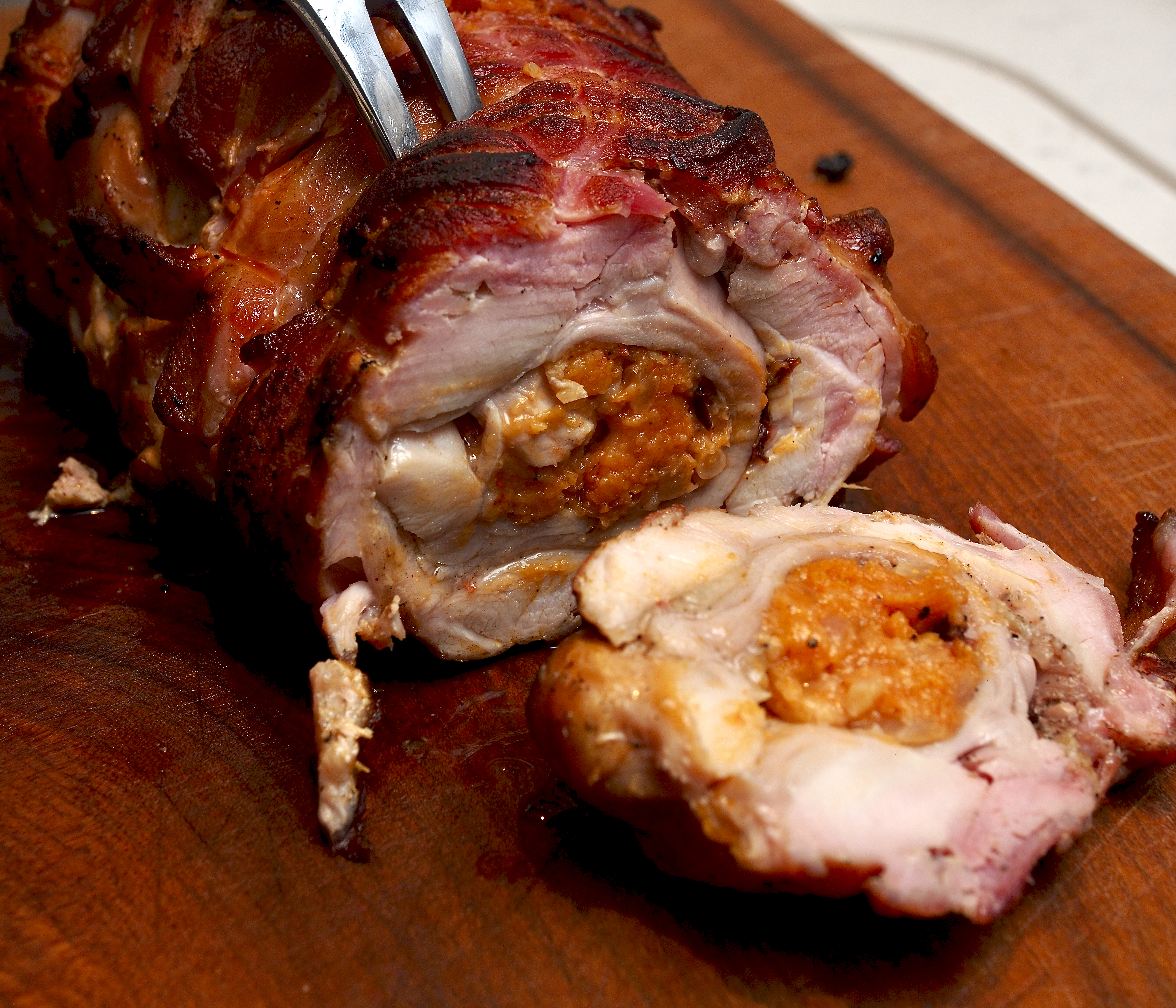 Make a pile of the stuffing, shaping with your hands, about 7cm from the less fat end of the rabbit. You need to leave a generous margin near the edges so the stuffing doesn’t squeeze out. Roll the rabbit into a fat log shape, tucking in the sides as you go. Wrap the joint in the bacon or pancetta and tie firmly widthways and lengthways with kitchen string. You can set it aside in the fridge for a while now if you need, we found this useful to firm it up a bit.