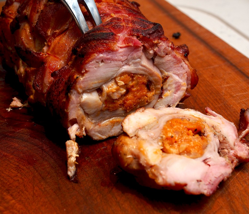Make friends with your butcher and ask them to debone the rabbit for you. The stuffing and rolling seems a bit tricky when you’re doing it and ours looked far from pretty but if you tie it tightly with string, wrap in some cling film and leave in the fridge for an hour, it will all stay together nicely and looks great when you cut it out. Be brave.