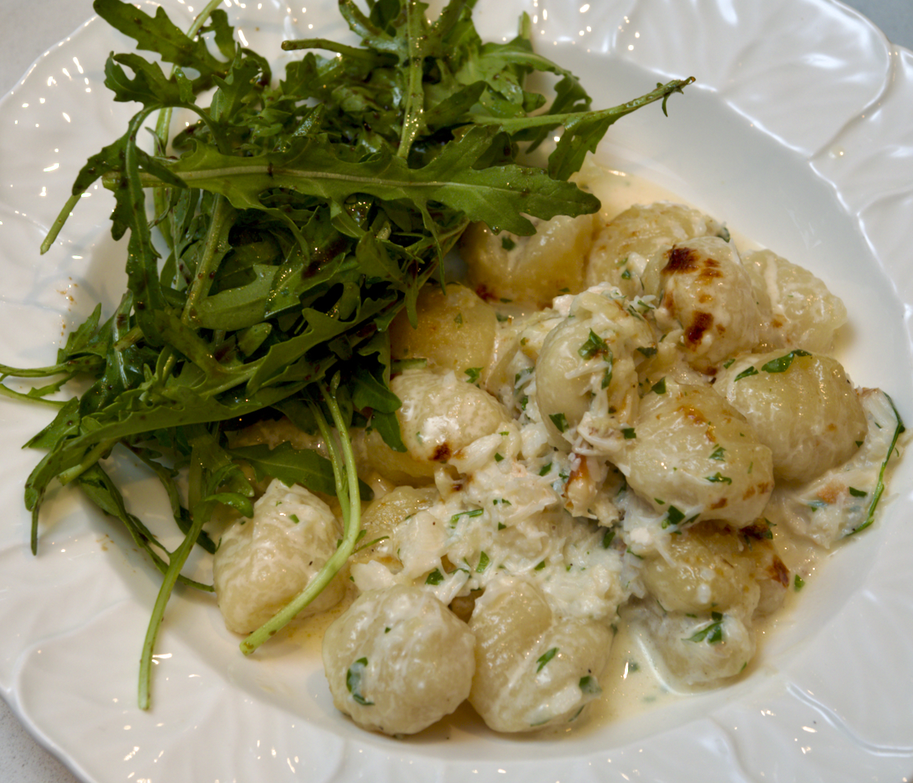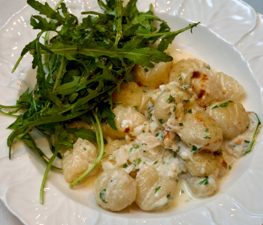 Heat the cream in a large pan, then add the Parmesan and lemon juice. Let it bubble up, then turn off the heat and add the crab, parsley and gnocchi. Sesson well with black pepper, then tip it all into a baking dish.
