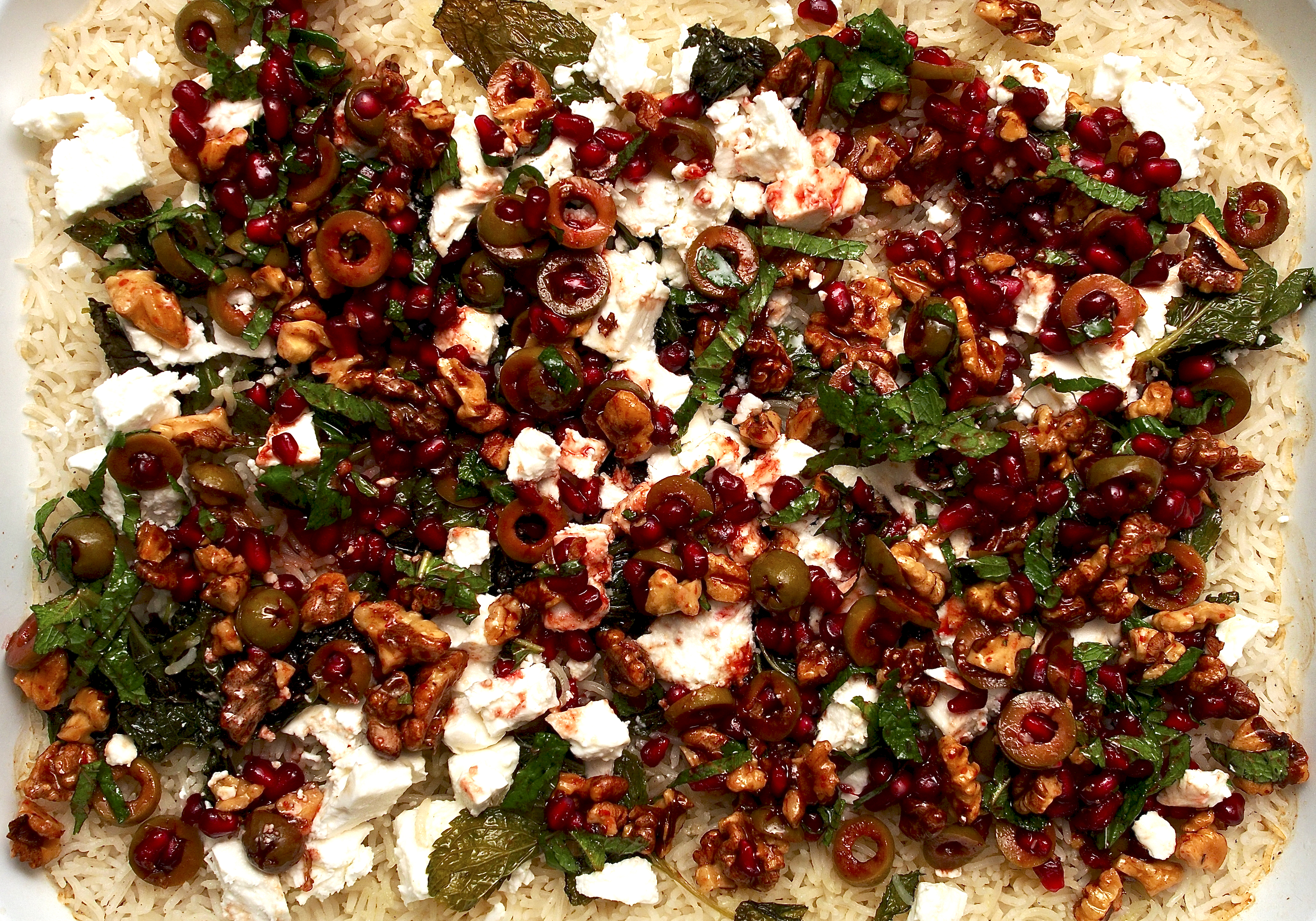 When the rice is cooked, fork through the olives, remaining herbs and lemon juice with a good glug of your best extra virgin olive oil. Transfer to a serving platter, then scatter over the feta and mound the prawns on top. Drizzle again with olive oil and serve with lemon wedges.