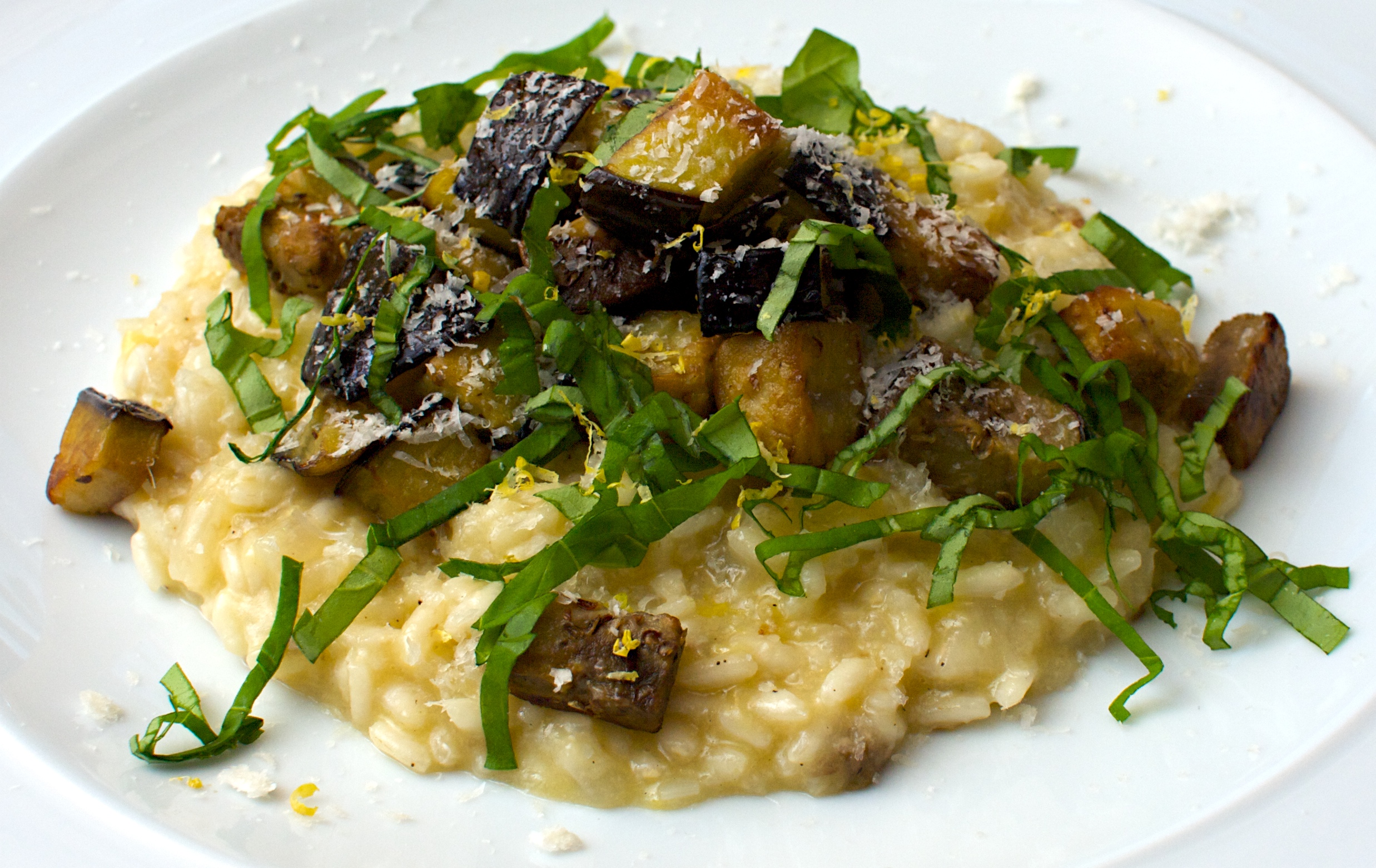 Serve the risotto sprinkled with the diced aubergine, the rest of the Parmesan, the basil and the rest of the lemon zest.